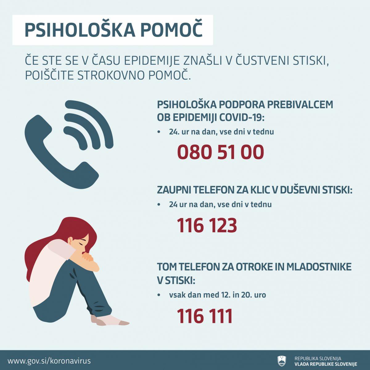 Pri tem naj še omenimo, da je vam na razpolago tudi brezplačna telefonska številka 080 51 00, na kateri vam bodo 24 ur na dan, vse dni v tednu strokovno pomoč nudili izkušeni psihologi, psihoterapevti in drugi strokovnjaki s področja duševnega zdravja. "S telefonom želimo zagotoviti dostopno podporo ljudem, ki se v času epidemije in z njo povezanih kriznih ukrepov soočajo z različnimi stiskami," so navedli na Facebook strani vlade.