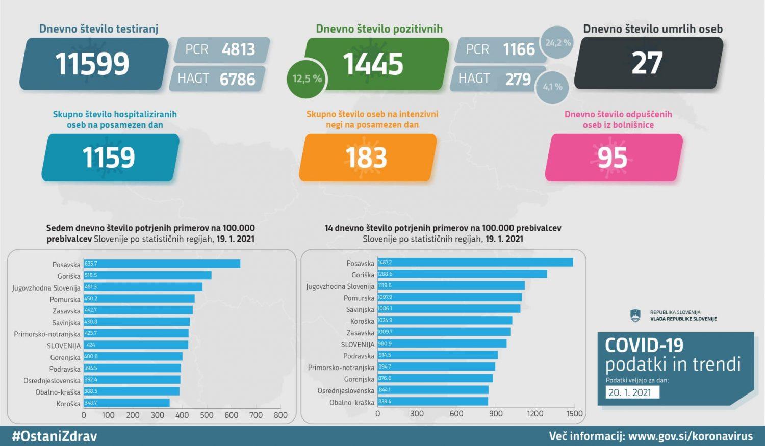 Od 4813 opravljenih PCR testov je bilo pozitivnih 1166, kar znaša 24,2 odstotka. Od 6786 hitrih testov pa je bilo pozitivnih 279, kar znaša 4,1 odstotka. V sredo je umrlo 27 bolnikov s covidom-19, je na novinarski konferenci o aktualnem stanju glede bolezni Covid-19 povedala Maja Bratuša.