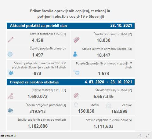 V petek so v Sloveniji opravili 4.458 PCR testov in z njimi potrdili 1.497 okužb z novim koronavirusom, dan pred tem so ob 7.507 PCR testih potrdili 2.270 novih okužb. Delež pozitivnih PCR testov je znašal 33,5 odstotka, dan pred tem 30,2 odstotka. Včeraj so sicer v državi opravili tudi 18.030 hitrih testov, ki jih v primeru pozitivnega izvida preverijo še s PCR-testi. Dan pred tem 33.085.