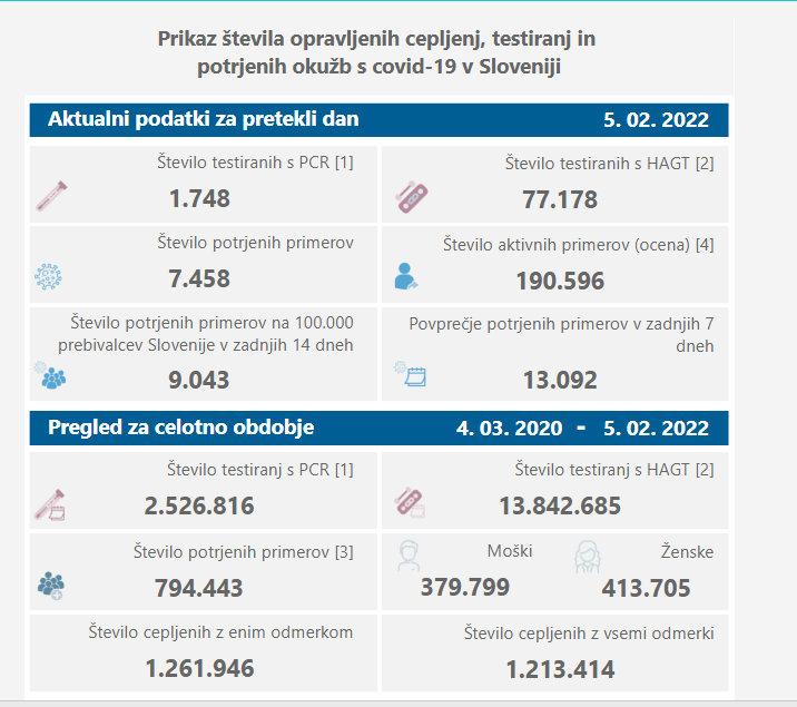 V soboto so v državi ob 1748 PCR-testih in 77.178 hitrih antigenskih testih potrdili 7458 okužb z novim koronavirusom. Dan prej pa jih so ob 4030 PCR-testih in 115.994 hitrih antigenskih testih potrdili 11.680.