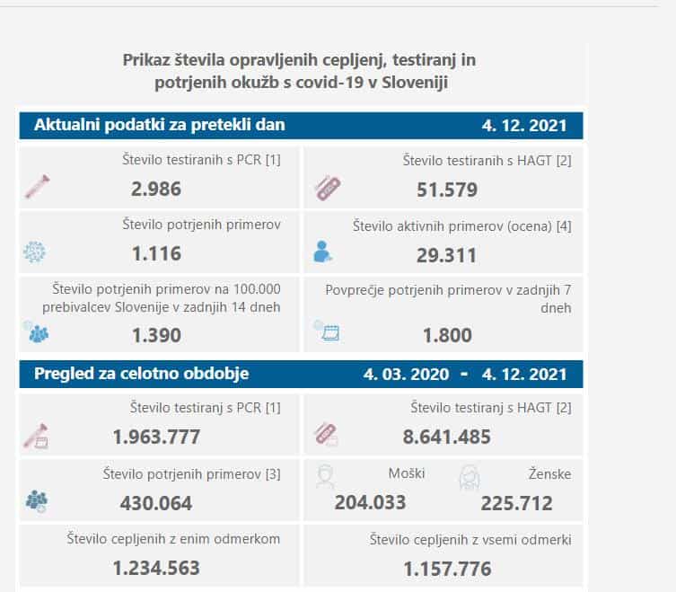 V soboto so v Sloveniji ob 2986 PCR-testih potrdili 1116 okužb z novim koronavirusom, dan pred tem so ob 5513 PCR-testih potrdili 1908 okužb. Delež pozitivnih PCR-testov znaša 37,4 odstotka, dan pred tem 34,6 odstotka. Opravili so tudi 51.579 hitrih antigenskih testov, katerih pozitivne rezultate potrjujejo še s PCR-testiranjem, dan pred tem 92.705.