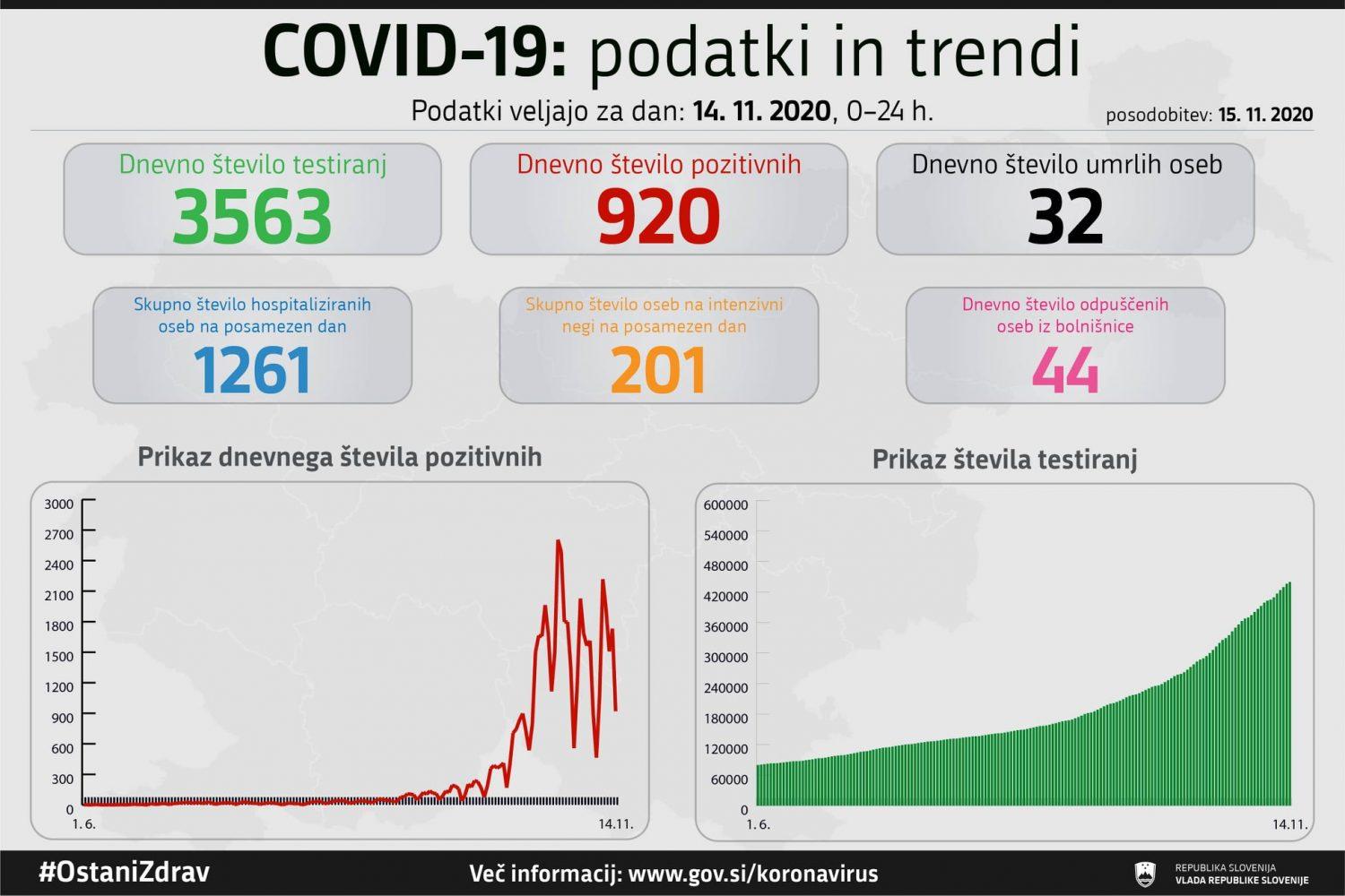 Trend obolelosti s koronavirusom v Sloveniji na dan 14. 11. 2020 (00:00-24:00):