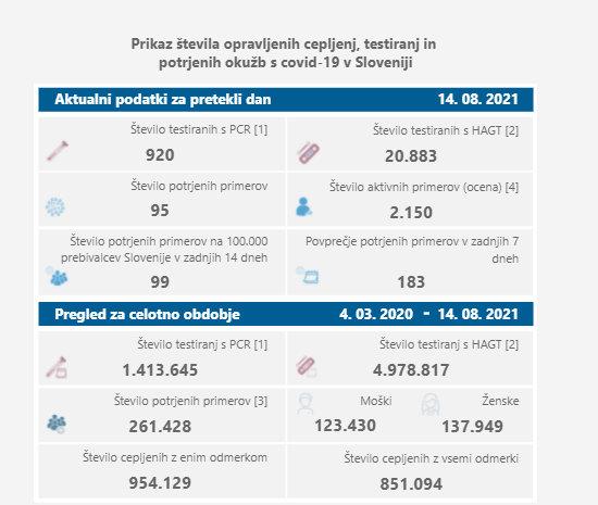 Trenutno je v državi po ocenah NIJZ aktivnih 2150 primerov okužb (dan pred tem 2114). Sedemdnevno povprečje števila potrjenih okužb pa znaša 183 (dan prej 180). Medtem je 14-dnevno povprečje števila okužb na 100.000 prebivalcev znašalo 99, dan pred tem 98.