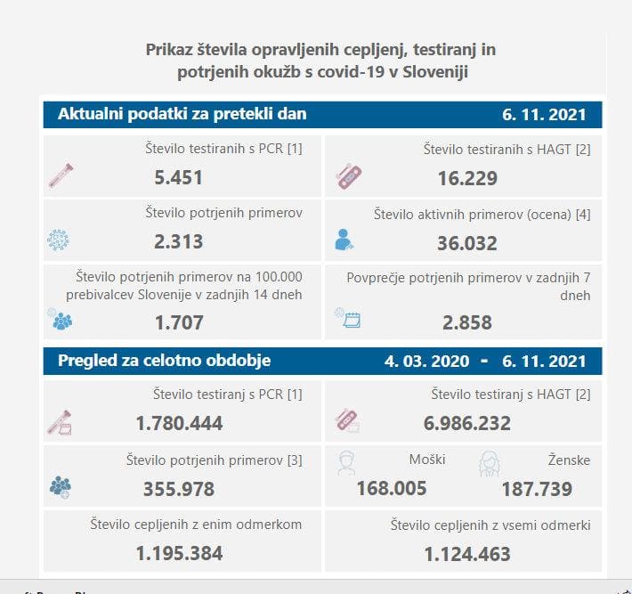 Po oceni NIJZ je v državi 36.032 aktivnih primerov okužbe, dan pred tem 35.216. Sedemdnevno povprečje potrjenih primerov se je dvignilo na 2858, dan pred tem je znašalo 2766. Štirinajstdnevno povprečje potrjenih okužb na 100.000 prebivalcev pa je 1707, dan pred tem 1669.