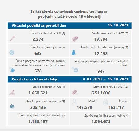 V soboto v Sloveniji opravili 2.274 PCR testov in z njimi potrdili 632 okužb z novim koronavirusom, dan pred tem so ob 5.713 PCR testih potrdili 1.437 novih okužb. Delež pozitivnih PCR testov je znašal 27,8 odstotka, dan pred tem 25,2 odstotka. Včeraj so sicer v državi opravili tudi 13.794 hitrih testov, ki jih v primeru pozitivnega izvida preverijo še s PCR-testi. Dan pred tem 30.587.