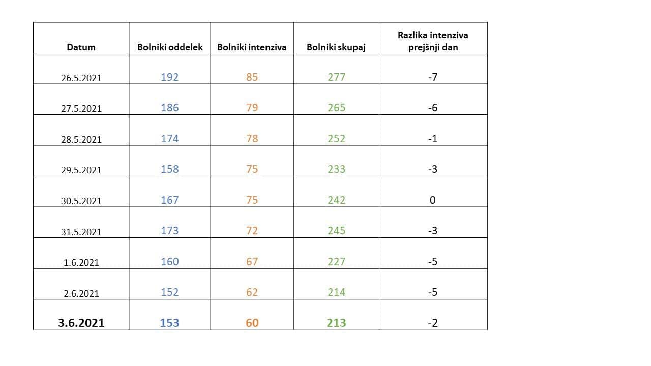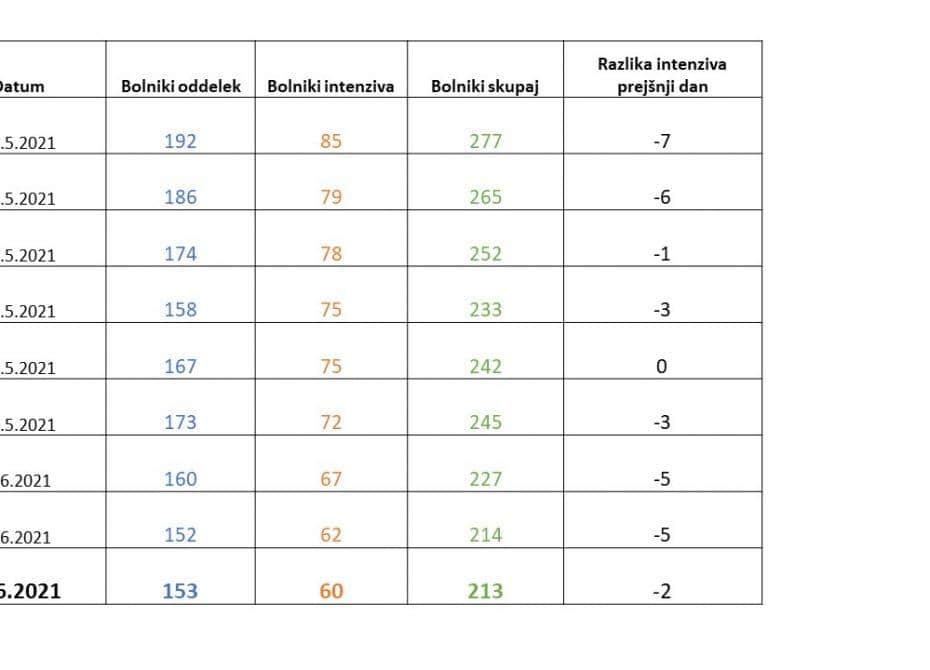 Danes je v bolnišnicah skupaj zasedenih 213 COVID postelj. Na intenzivni terapiji je zasedenih 60 postelj oziroma 2 manj kot včeraj. V bolnišnice je bilo sprejetih 21 oseb, iz bolnišnic pa je bilo odpuščenih 19 oseb. Tri osebe so umrle.
