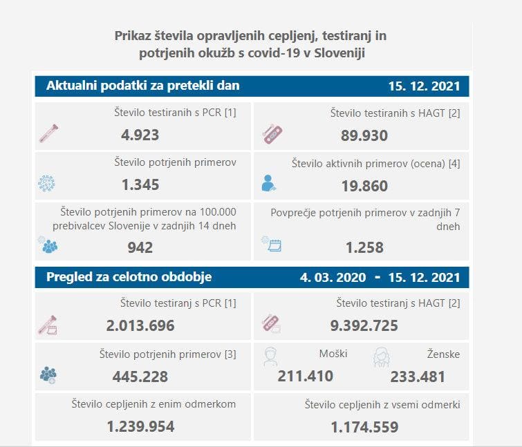 V sredo so v Sloveniji ob 4923 PCR-testih potrdili 1345 okužb z novim koronavirusom, dan pred tem so ob 5903 PCR-testih potrdili 1526 okužb. Delež pozitivnih PCR-testov znaša 27,3 odstotka, dan pred tem 25,8 odstotka. Opravili so tudi 89.930 hitrih antigenskih testov, katerih pozitivne rezultate potrjujejo še s PCR-testiranjem, dan pred tem 64.783.
