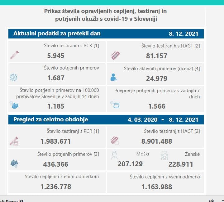 V sredo so v Sloveniji ob 5945 PCR-testih potrdili 1687 okužb z novim koronavirusom, dan pred tem so ob 6571 PCR-testih potrdili 1847 okužb. Delež pozitivnih PCR-testov znaša 28,4 odstotka, dan pred tem 28,1 odstotka. Opravili so tudi 81.157 hitrih antigenskih testov, katerih pozitivne rezultate potrjujejo še s PCR-testiranjem, dan pred tem 58.532.