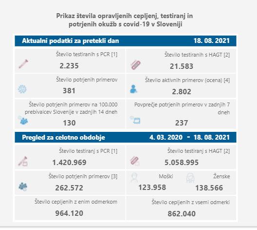 Trenutno je v državi po ocenah NIJZ aktivnih 2802 primerov okužb (dan pred tem 2.560). Sedemdnevno povprečje števila potrjenih okužb pa znaša 237 (dan prej 218). Medtem je 14-dnevno povprečje števila okužb na 100.000 prebivalcev znašalo 130, dan pred tem 118.