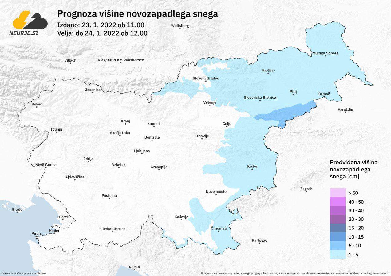 Tekom popoldneva bo v severovzhodni Sloveniji občasno rahlo snežilo. Rahlo sneženje se bo ponoči prehodno razširilo nad večji del vzhodne Slovenije. Količina padavin bo zelo majhna. V ponedeljek zjutraj se boste v večjem delu vzhodne Slovenije prebudili v belo jutro a bo snega le za vzorec. Še največ ga bo zapadlo na območju Haloz in v delu Podravja, kjer lahko zapade nad 5 cm suhega snega.