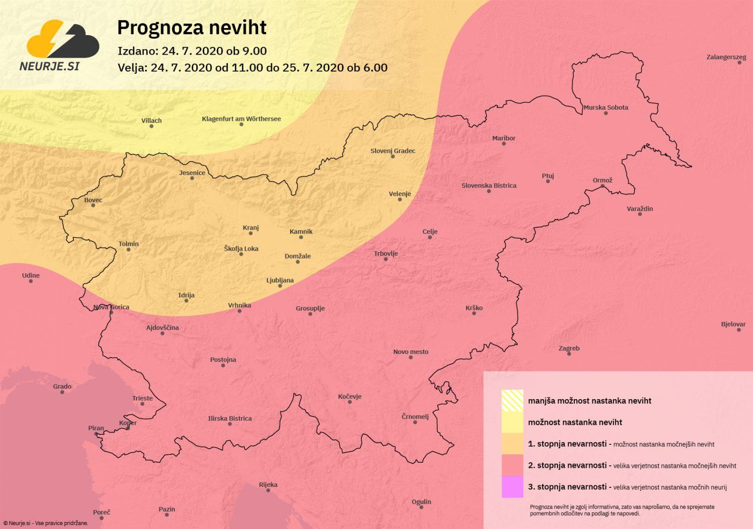 Obalo in Hrvaško Istro bo od zahoda predvidoma dosegel nevihtni sistem, ki ga lahko spremljajo močnejši sunki nevihtnega piša, medtem ko bodo v zaledju obale in v notranjosti Slovenije nastajale predfrontalne nevihte. Te lahko v primeru izoliranosti in organizacije ob ugodnem vetrovnem striženju (predvidoma 15 – 20 m/s) prinesejo močne nalive, sunke vetra in točo, napovedujejo na Neurje.si
