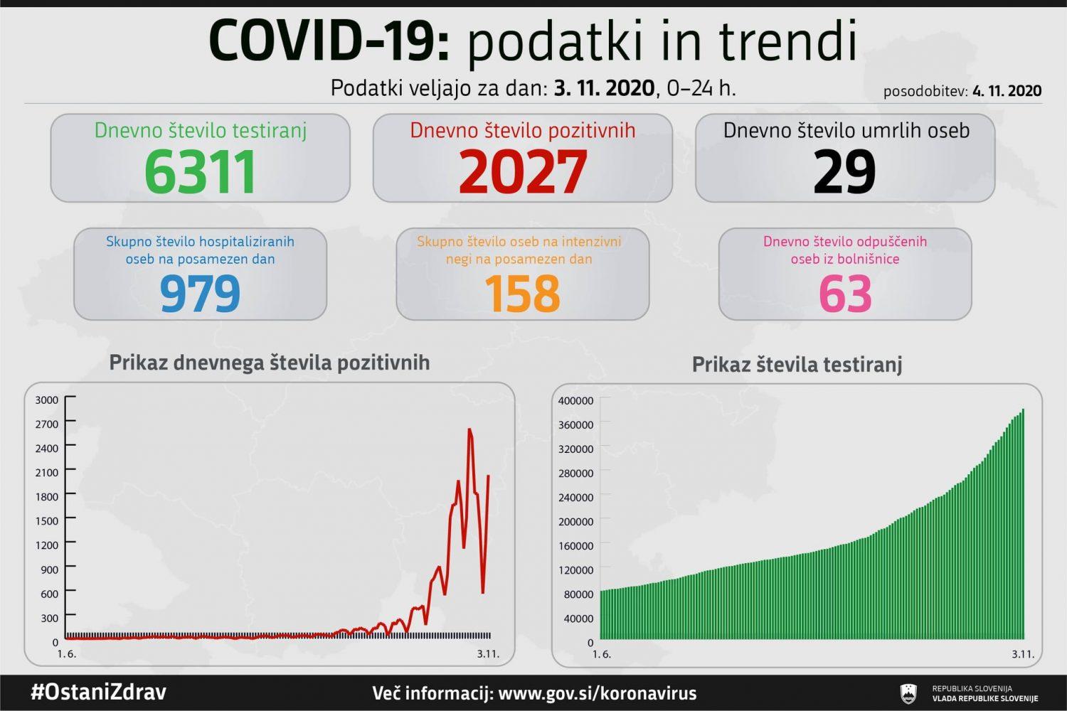 V bolnišnicah je 979 bolnikov s covidom-19, 158 jih potrebuje intenzivno zdravljenje. V domačo oskrbo so odpustili 63 oseb, umrlo pa je 29 bolnikov s covidom-19.