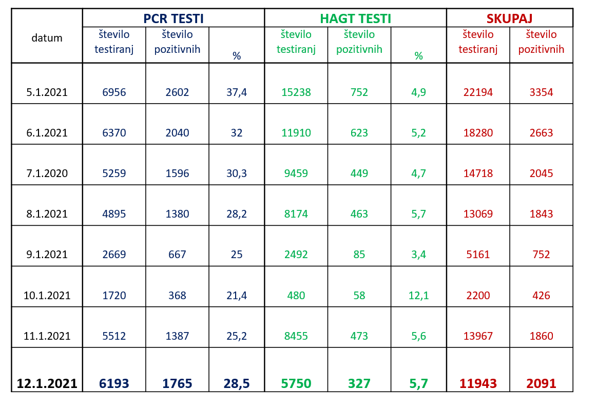 Trend obolelosti s koronavirusom v Sloveniji na dan 12. 1. 2021 (00:00-24:00):
