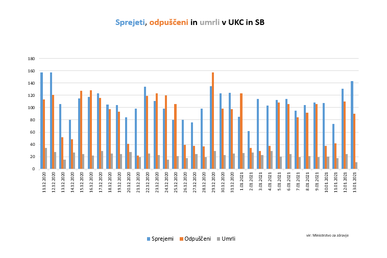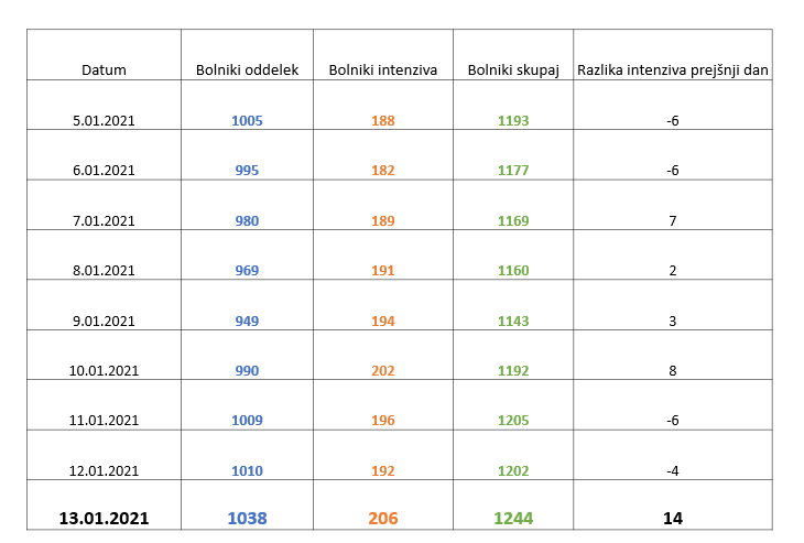 Včeraj je bilo iz bolnišnic skupaj odpuščenih 90 pacientov. Na novo je bilo sprejetih 143 ljudi. Skupaj je bolnišnično oskrbo včeraj potrebovalo 1244 pacientov (44 več kot v ponedeljek). Na intenzivni terapiji se je zdravilo 206 covidnih pacientov oziroma 14 več kot v ponedeljek.