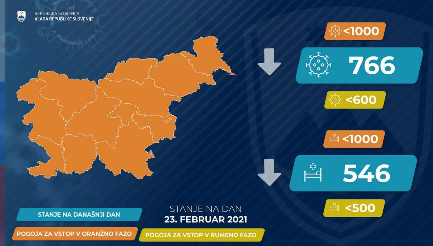 Vlada bo na današnji seji ponovno pretresala epidemiološke razmere v državi. Novih sprostitev sicer ni pričakovati, saj pogoja sedemdnevnega povprečja števila novih okužb in števila hospitaliziranih covidnih bolnikov za prehod v rumeno fazo še nista izpolnjena.