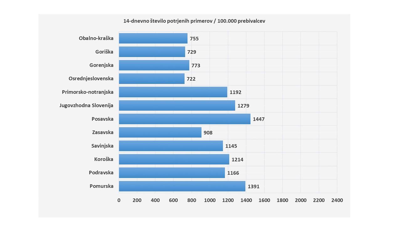 "Največ primerov Covid-19 v zadnjih 14 dneh na 100.000 prebivalcev beležimo v Posavju (1447), najmanj pa v Osrednjeslovenski regiji (722)," je pojasnil Kacin.