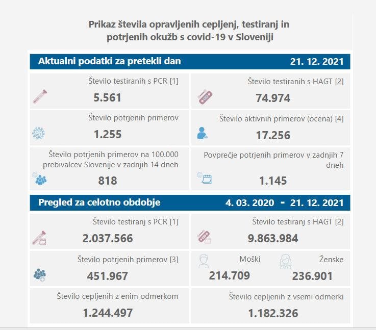 V torek so v Sloveniji ob 5561 PCR-testih potrdili 1255 okužb z novim koronavirusom, dan pred tem so ob 4973 PCR-testih potrdili 1555 okužb. Delež pozitivnih PCR-testov znaša 22,6 odstotka, dan pred tem 31,3 odstotka. Opravili so tudi 74.974 hitrih antigenskih testov, katerih pozitivne rezultate potrjujejo še s PCR-testiranjem, dan pred tem 110.865.