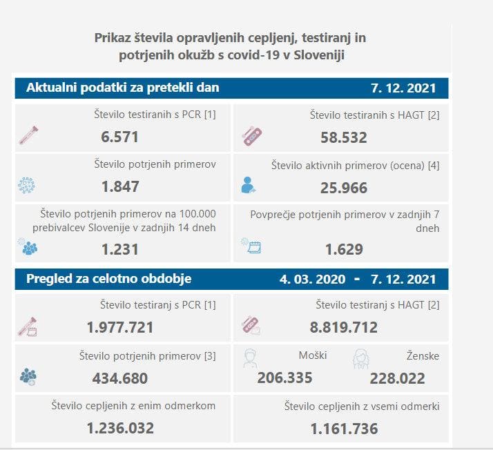 V torek so v Sloveniji ob 6571 PCR-testih potrdili 1847 okužb z novim koronavirusom, dan pred tem so ob 5471 PCR-testih potrdili 1950 okužb. Delež pozitivnih PCR-testov znaša 28,1 odstotka, dan pred tem 35,6 odstotka. Opravili so tudi 58.532 hitrih antigenskih testov, katerih pozitivne rezultate potrjujejo še s PCR-testiranjem, dan pred tem 95.318.