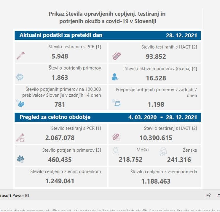 V torek so v Sloveniji ob 5948 PCR-testih potrdili 1863 okužb z novim koronavirusom, dan pred tem so ob 5334 PCR-testih potrdili 1813 okužb. Delež pozitivnih PCR-testov znaša 31,3 odstotka, dan pred tem 34 odstotkov. Opravili so tudi 93.852 hitrih antigenskih testov, katerih pozitivne rezultate potrjujejo še s PCR-testiranjem, dan pred tem 114.263.