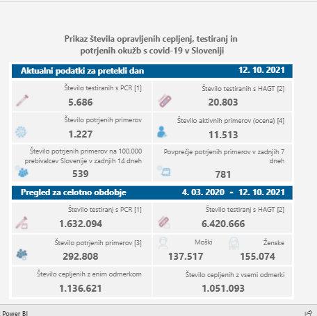 V torek so v Sloveniji opravili 5.686 PCR testov in z njimi potrdili 1.227 okužb z novim koronavirusom, dan pred tem so ob 4.558 PCR testih potrdili 1.005 novih okužb. Delež pozitivnih PCR testov je znašal 21,6 odstotka, dan pred tem 22 odstotkov. Včeraj so sicer v državi opravili tudi 20.803 hitrih testov, ki jih v primeru pozitivnega izvida preverijo še s PCR-testi. Dan pred tem 30.381.