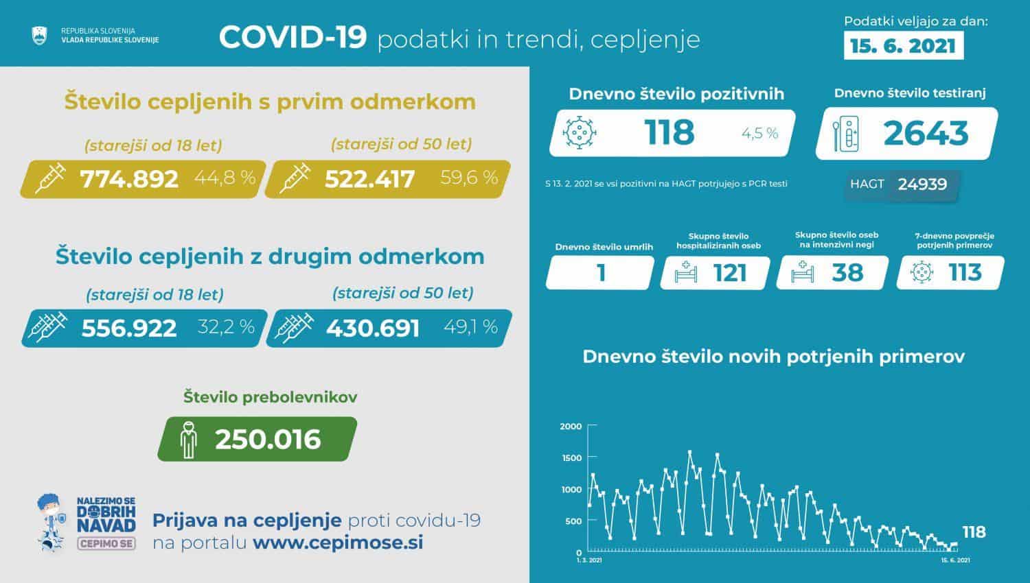 Trend obolelosti s koronavirusom ter število cepljenih in prebolevnikov v Sloveniji na dan 15. 6. 2021 (00:00-24:00)