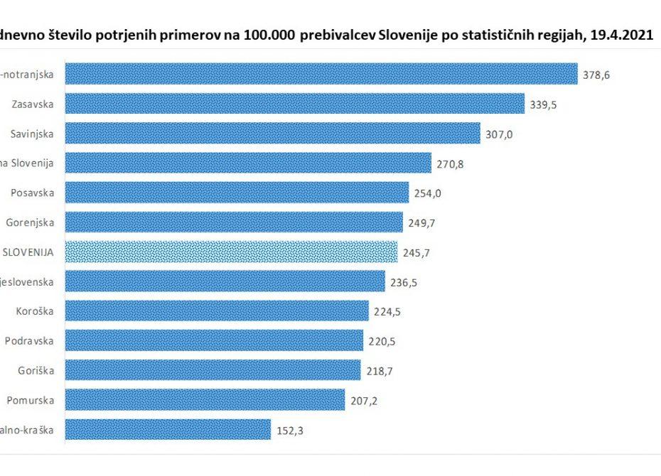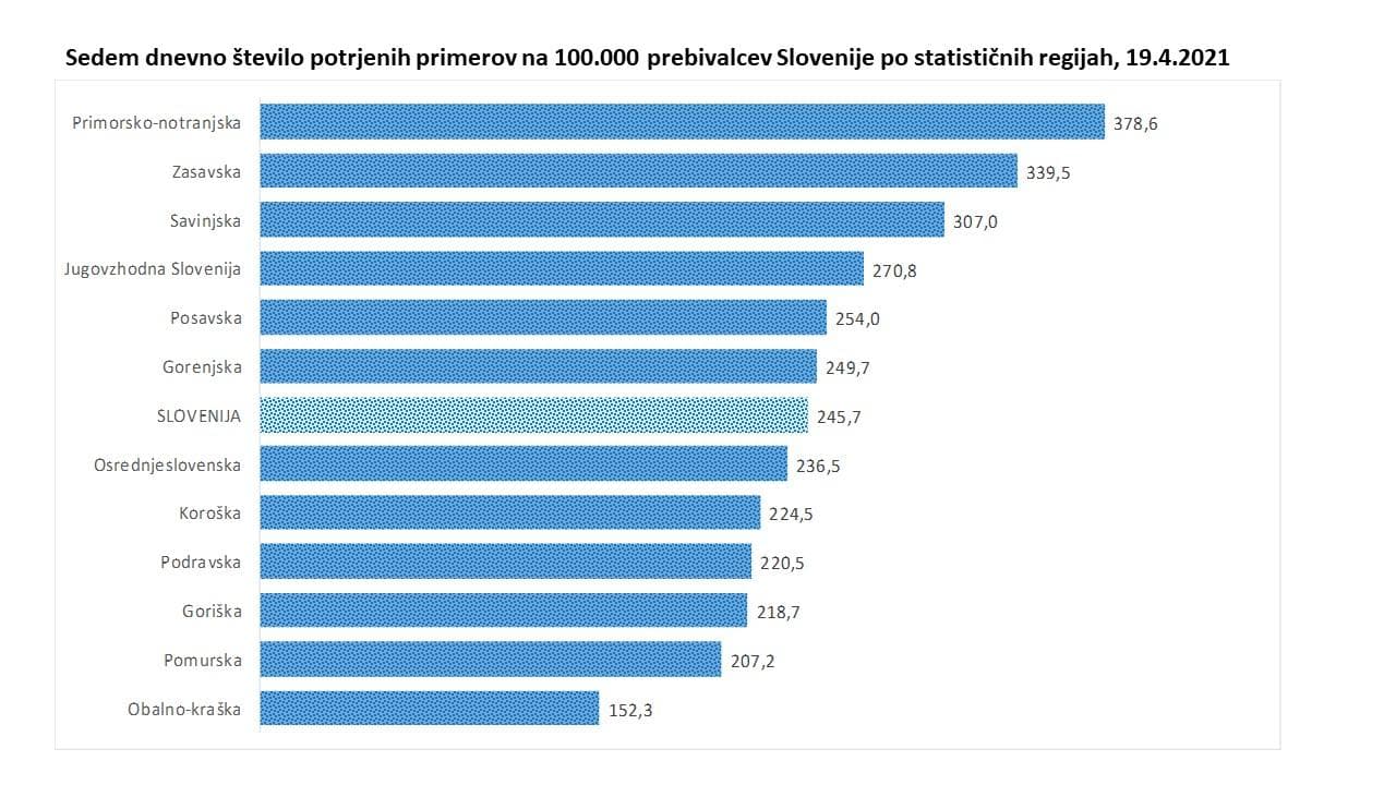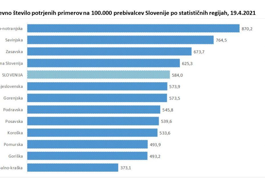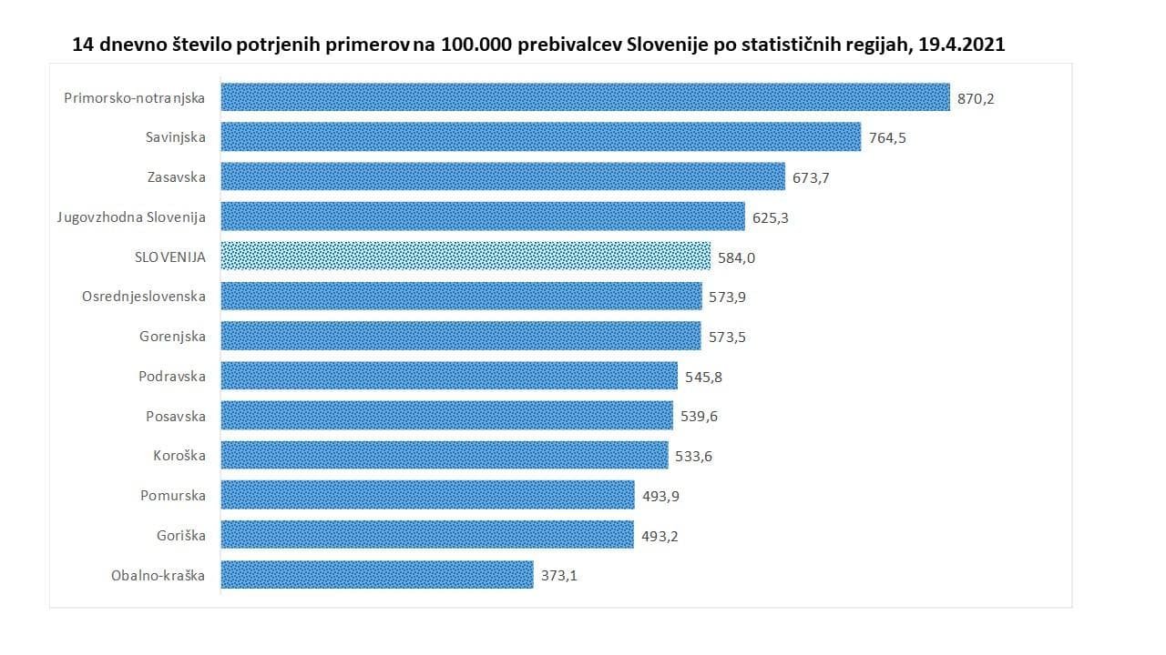 14-dnevna incidenca na ravni države znaša 584, 7-dnevna incidenca pa znaša 245,7. Regija z najvišjo 14-dnevno in 7-dnevno incidenco ostaja primorsko-notranjska, z najnižjo pa obalno-kraška. Obalno-kraška, goriška, pomurska, koroška, podravska in gorenjska regija pa so tiste, ki imajo 14-dnevno incidenco nižjo od državne incidence.