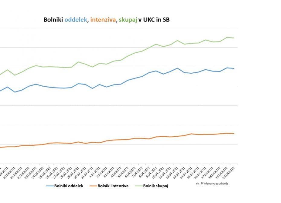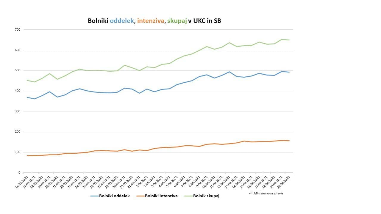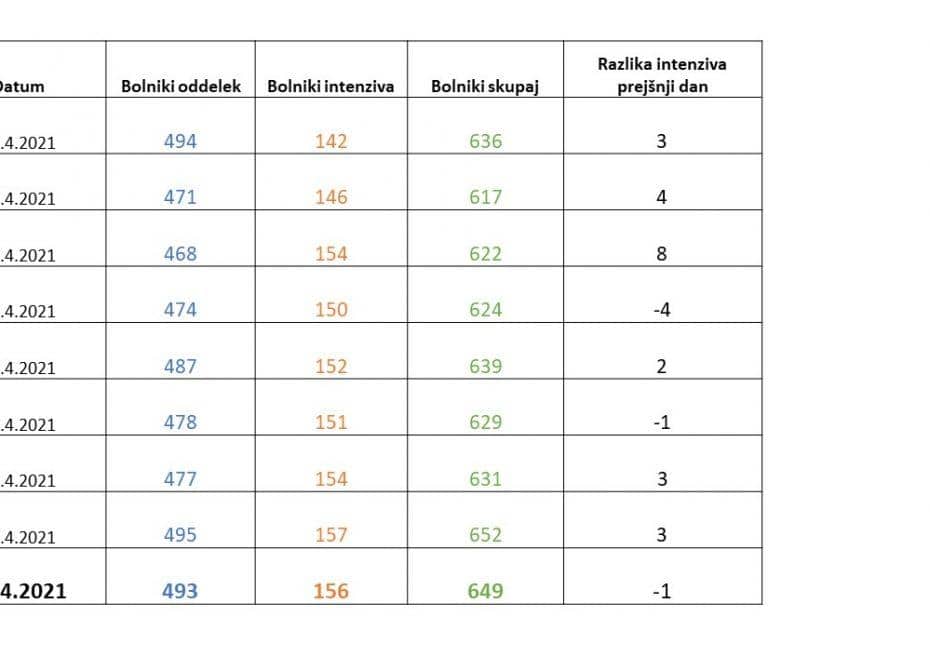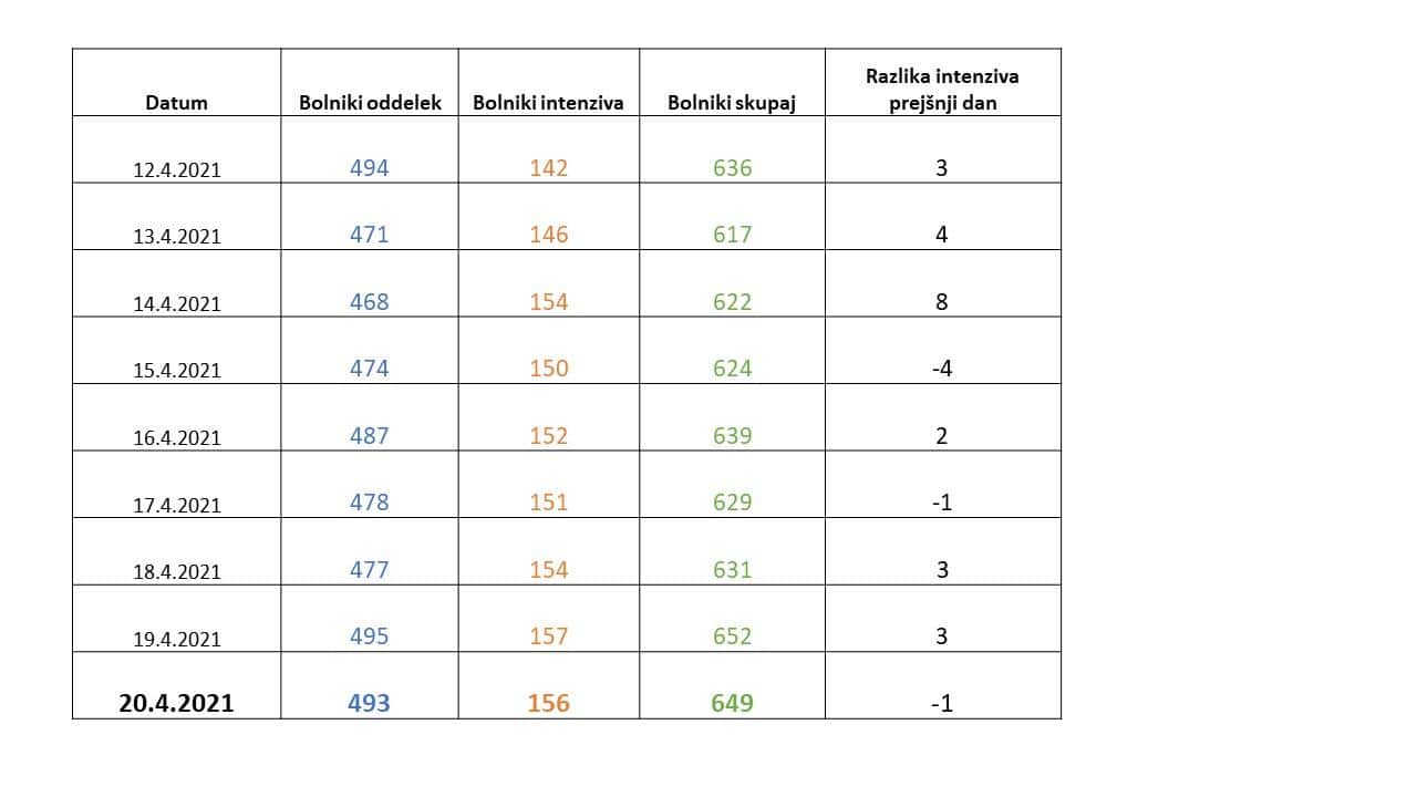 Število pacientov, ki zaradi okužbe s covidom-19 potrebujejo bolnišnično oskrbo, žal, tudi danes ostaja visoko. Skupaj se v bolnišnicah zdravi 649 pacientov, 3 manj kot včeraj. Na intenzivni terapiji se danes zdravi 156 pacientov, 1 manj kot včeraj. Kljub temu, da je bilo včeraj iz bolnišnic odpuščenih precej covid pacientov, skupaj 69, včeraj je bilo tudi novih sprejemov v bolnišnice veliko in sicer skupaj kar 71, kar kaže na to, da se razmere v bolnišnicah še ne izboljšujejo. V bolnišnicah je umrlo 5 oseb.