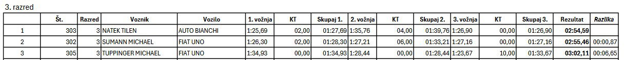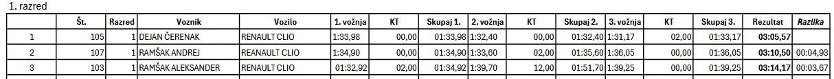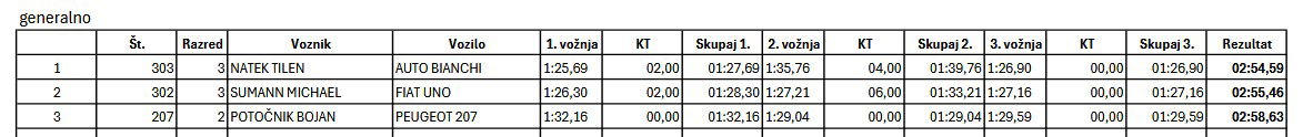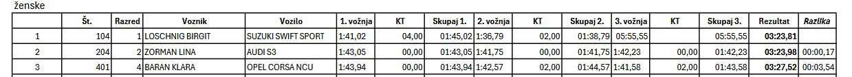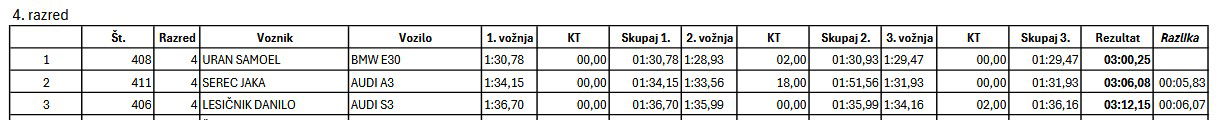 Časi v vseh štirih kategorijah so se gibali med dobrima dvema minutama, do najboljših časov, ki so merili komajda minuto in trideset sekund.