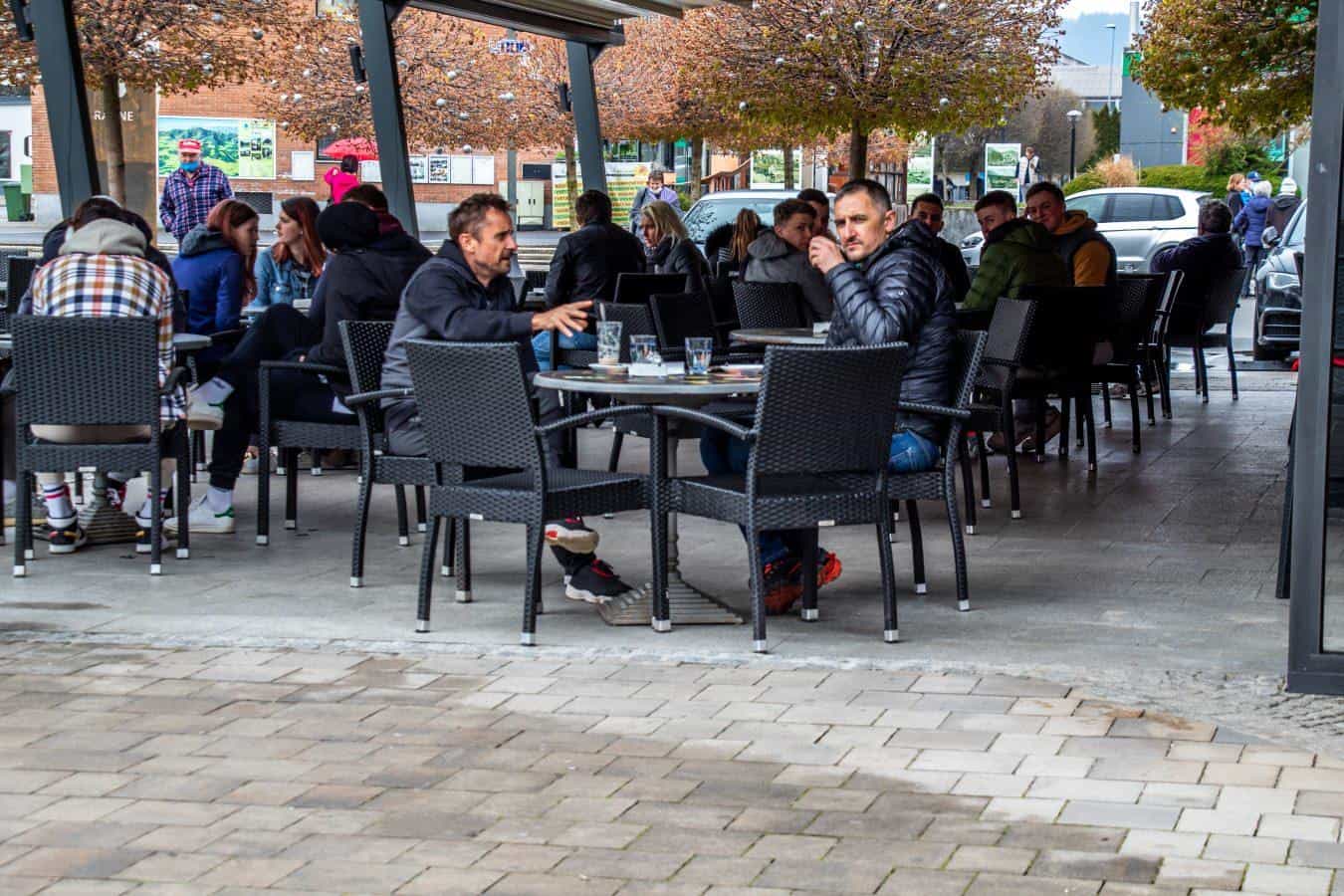 Na Ravnah smo v dopoldanskih urah lahko na terasah srečali in opazili več gostov kot zjutraj v Slovenj Gradcu, čeprav terase gostinskih lokalov tudi na tem koncu Koroške niso bile polne.
