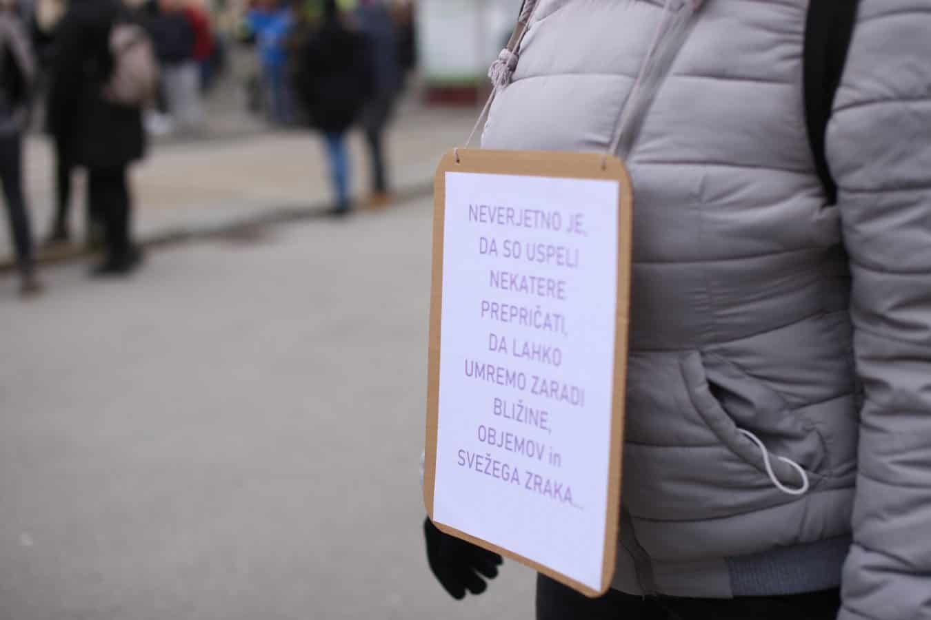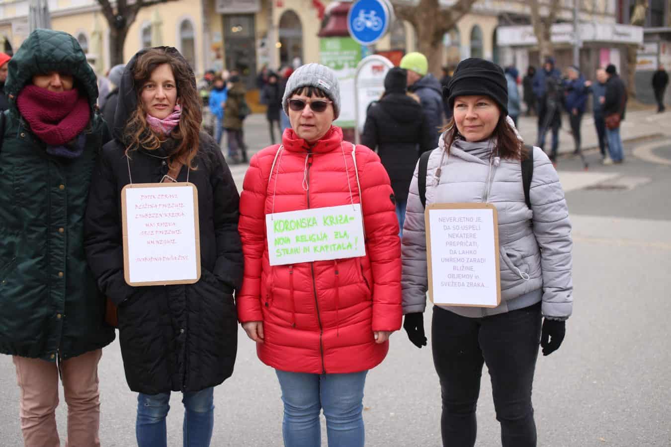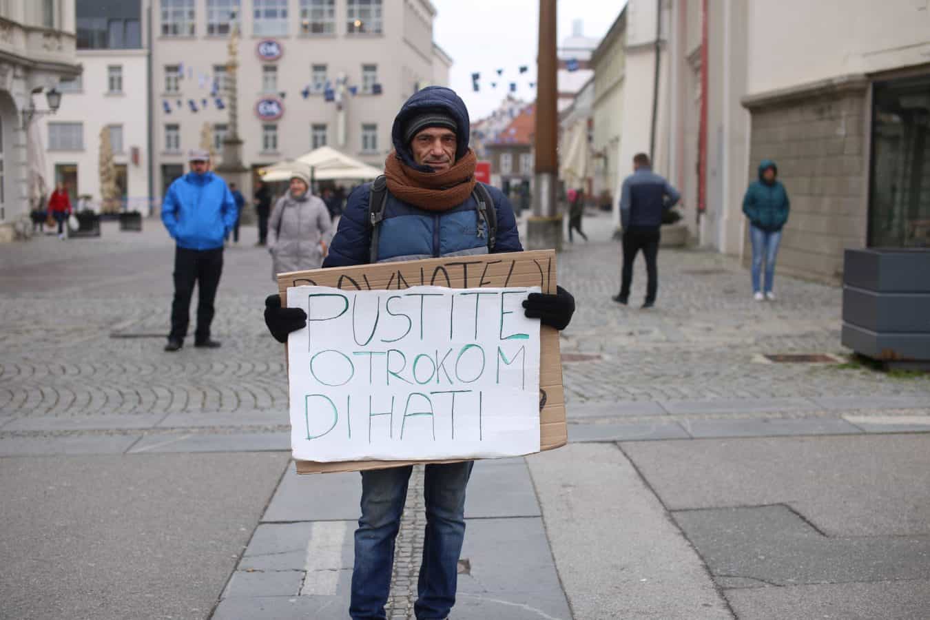 Nekateri protestniki so danes v Mariboru v rokah držali napise "Pustite otrokom dihati" in "Ravnatelji, kaj pa ugovor vesti."