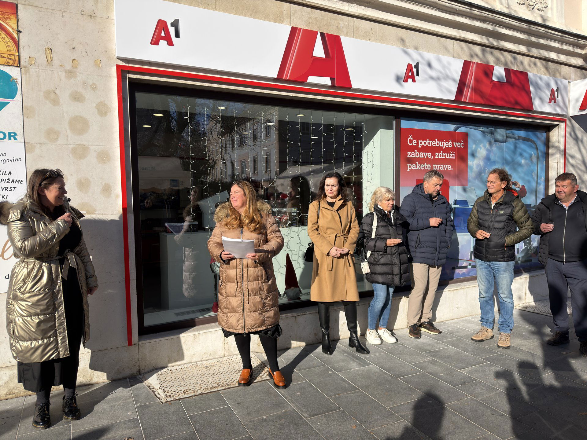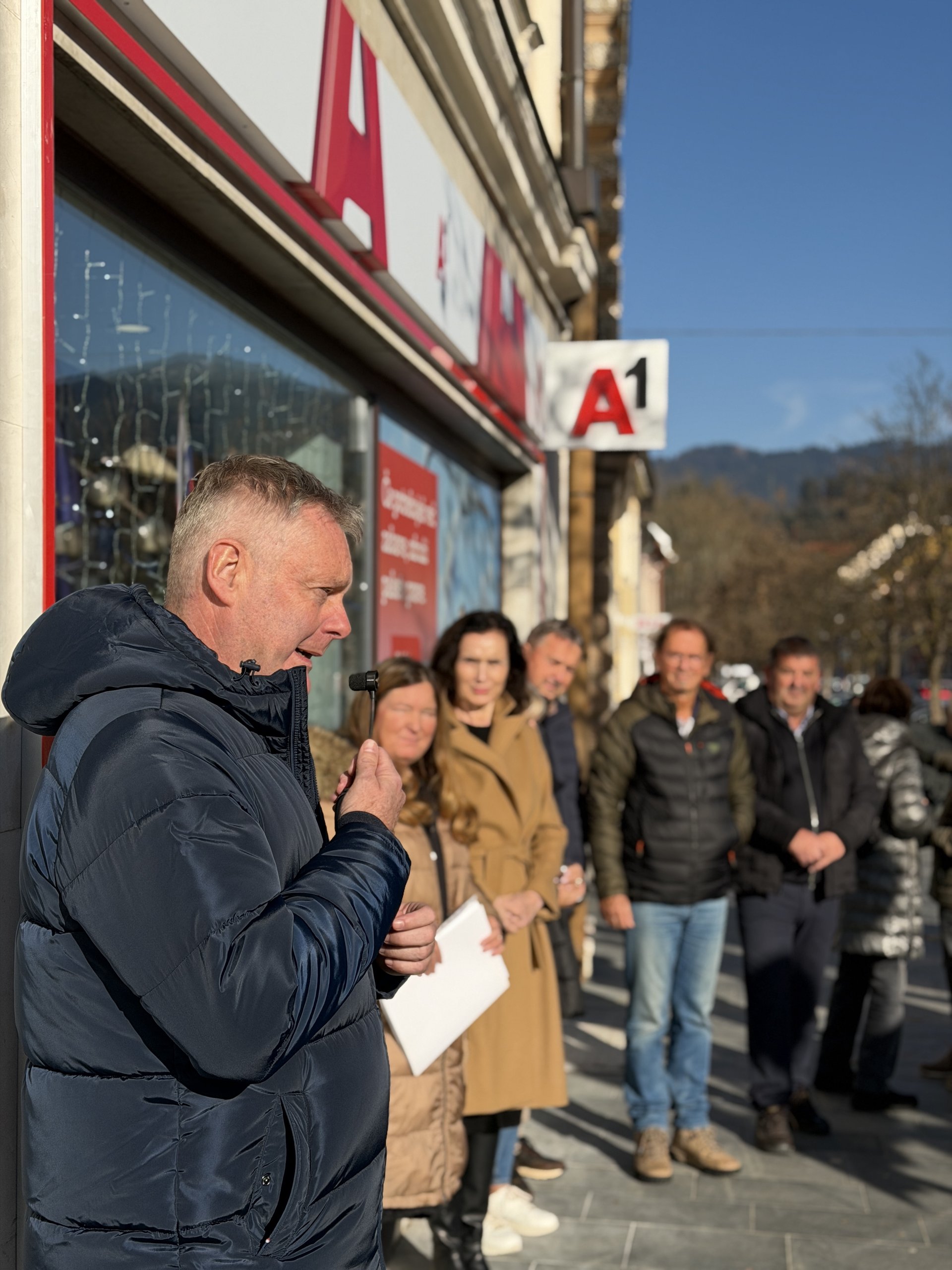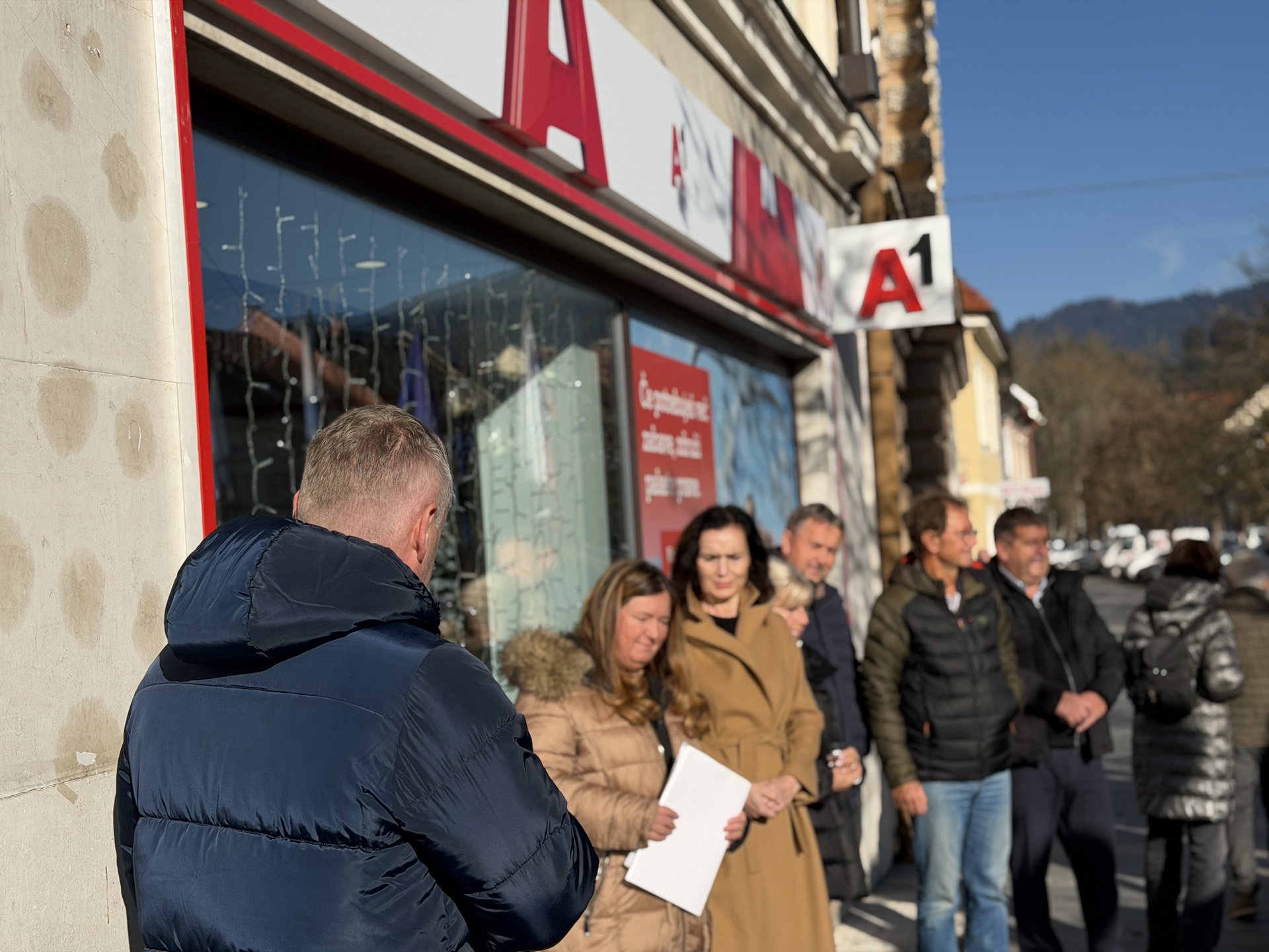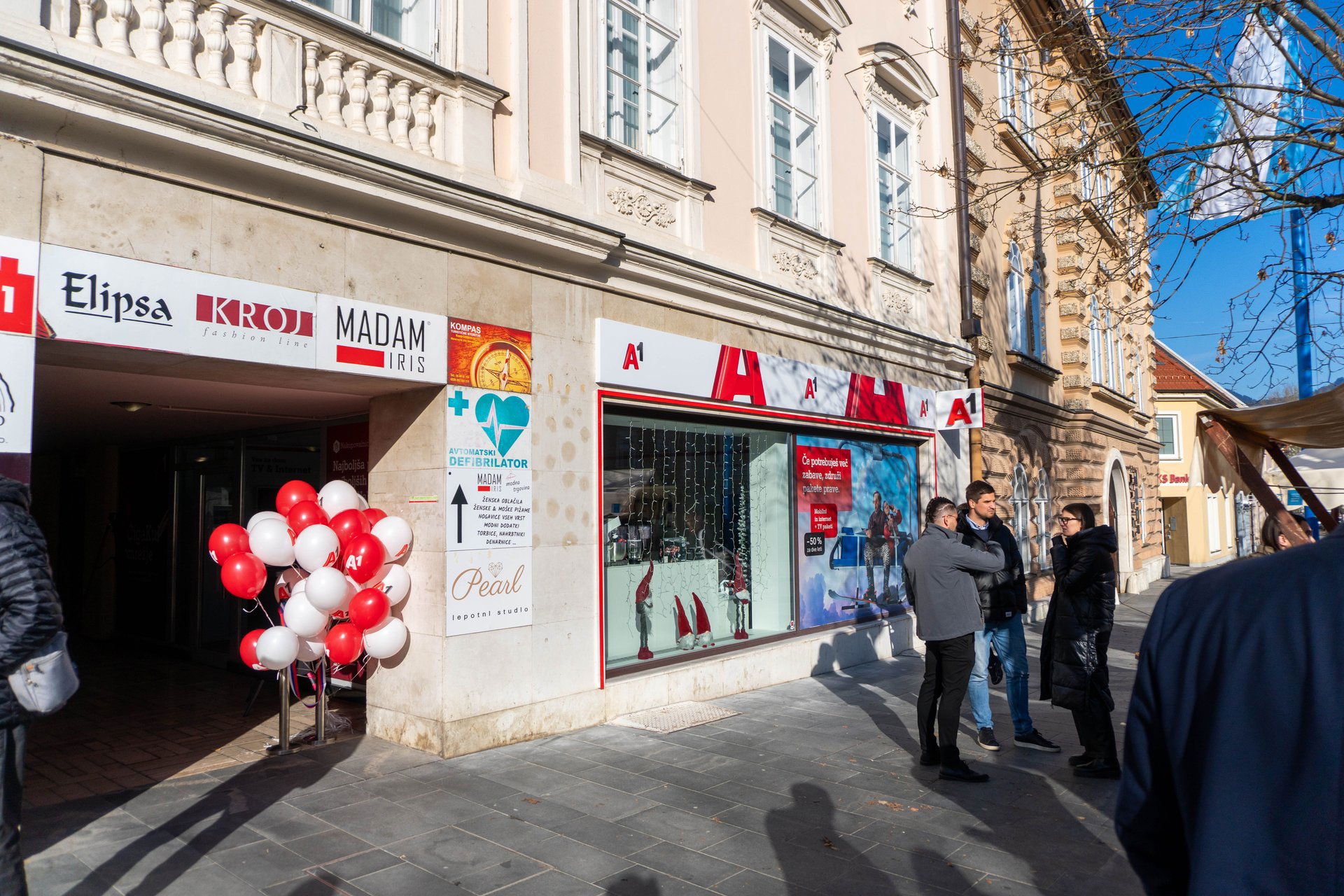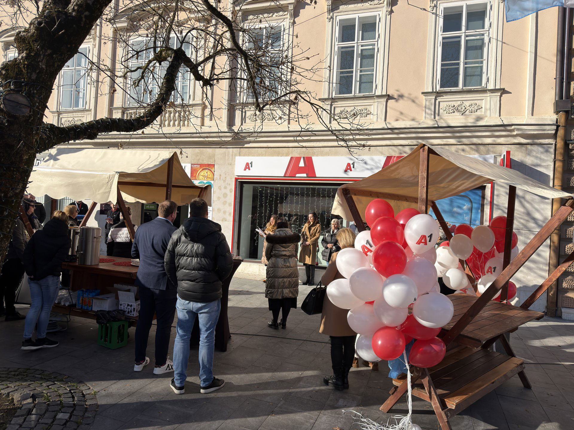 Na Glavnem trgu so se danes zbrali številni obiskovalci, predstavniki podjetja, župan Mestne občine Slovenj Gradec ter ostali povabljeni, da so skupaj slovesno odprli novo poslovalnico A1 v mestnem jedru.