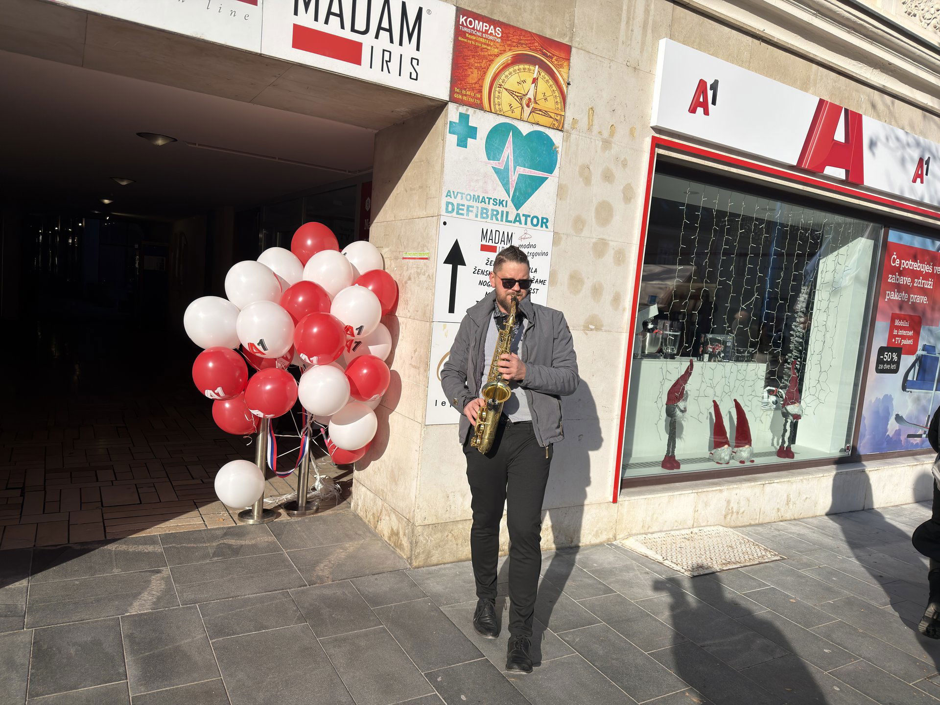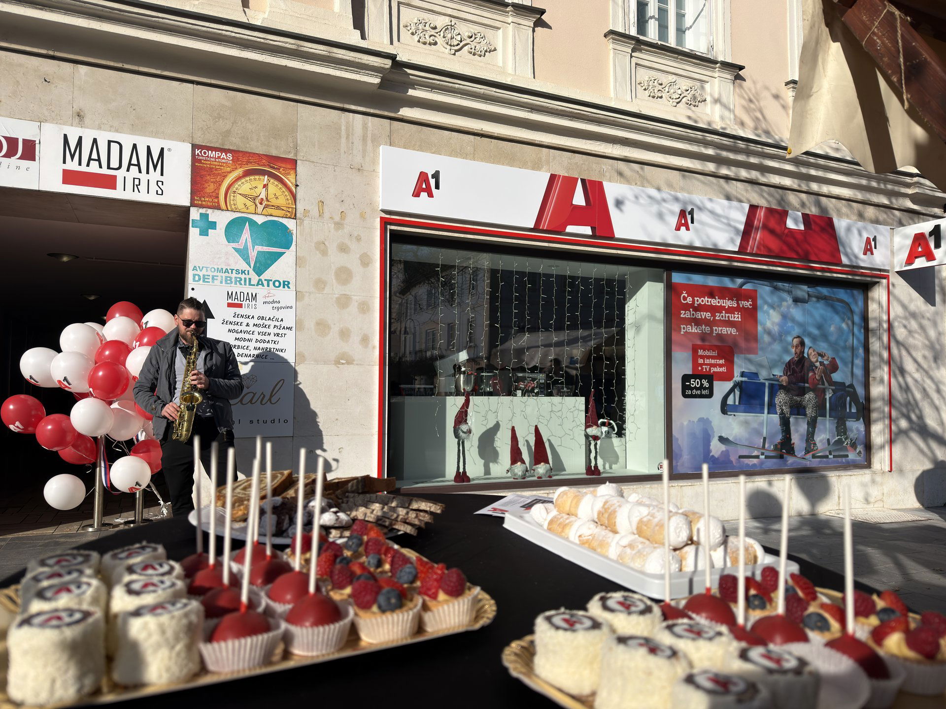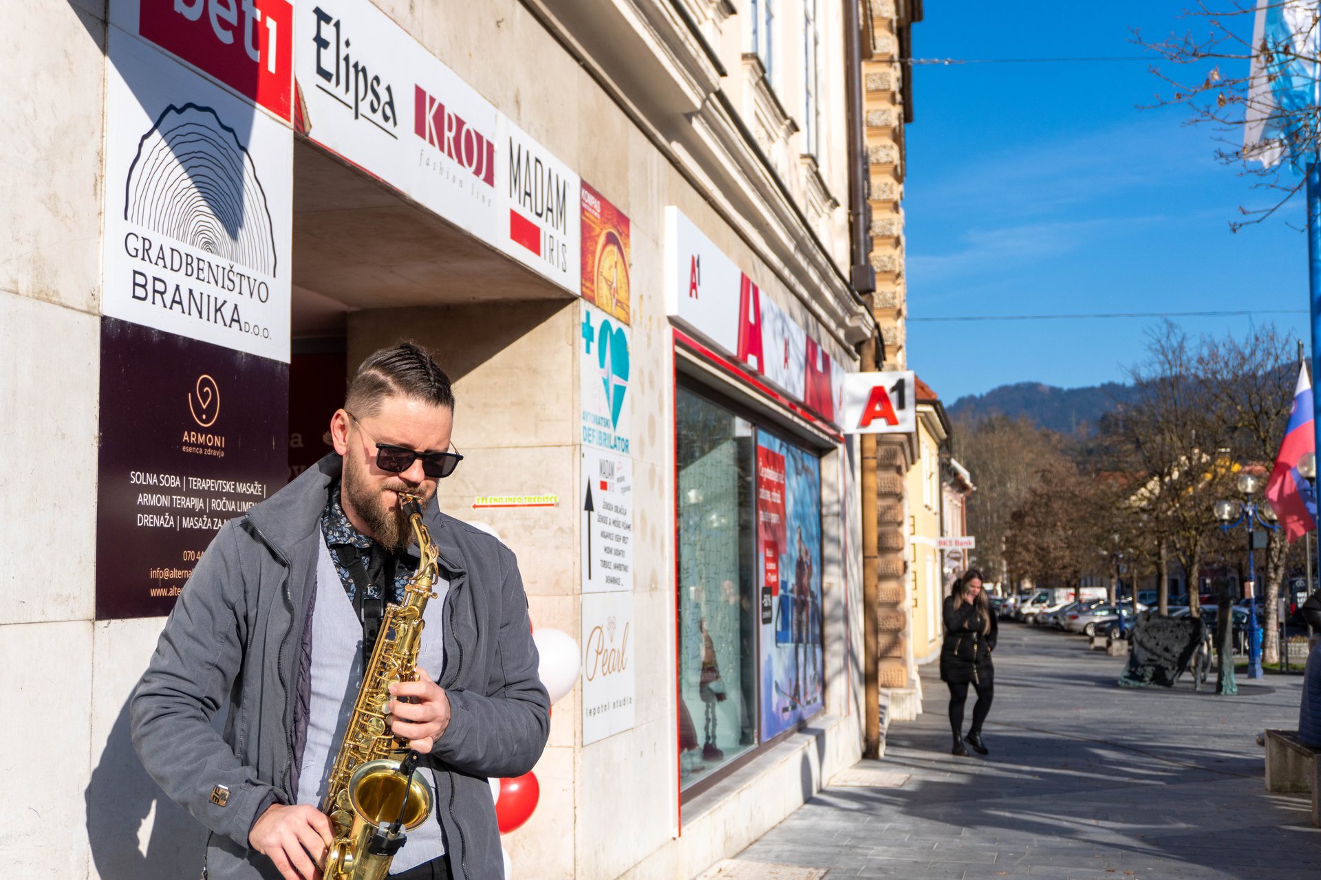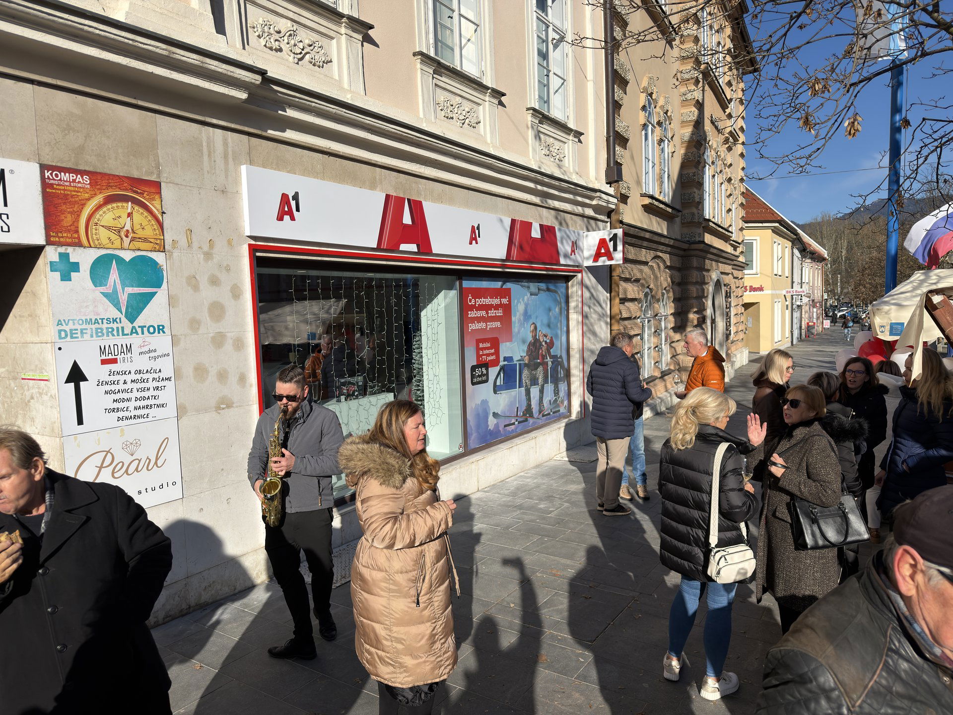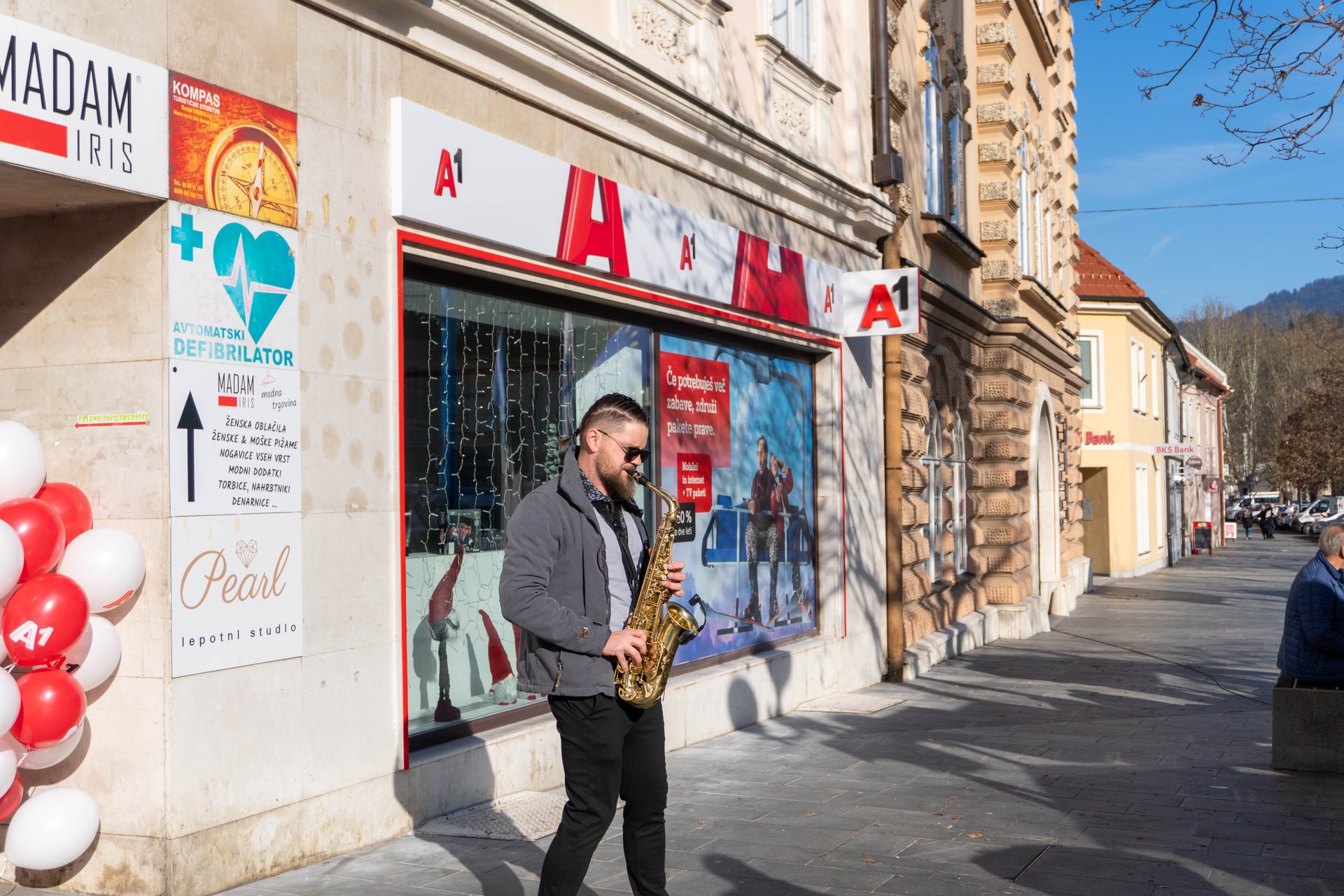 Ob odprtju nove prodajalne A1 na Koroškem, so v mestnem jedru pripravili slovesen prerez traku, pogostitev in kratek kulturni program, med katerim je za glasbo poskrbel saksofonist Gregor Šteharnik.