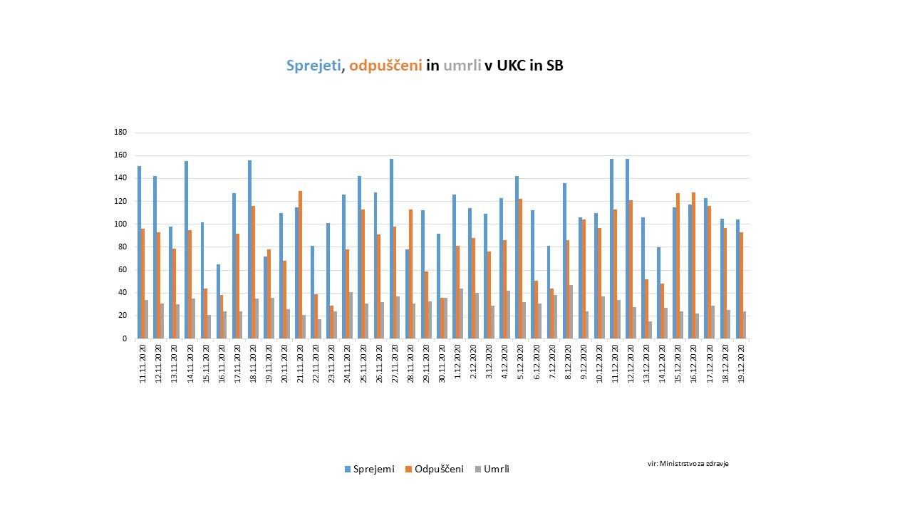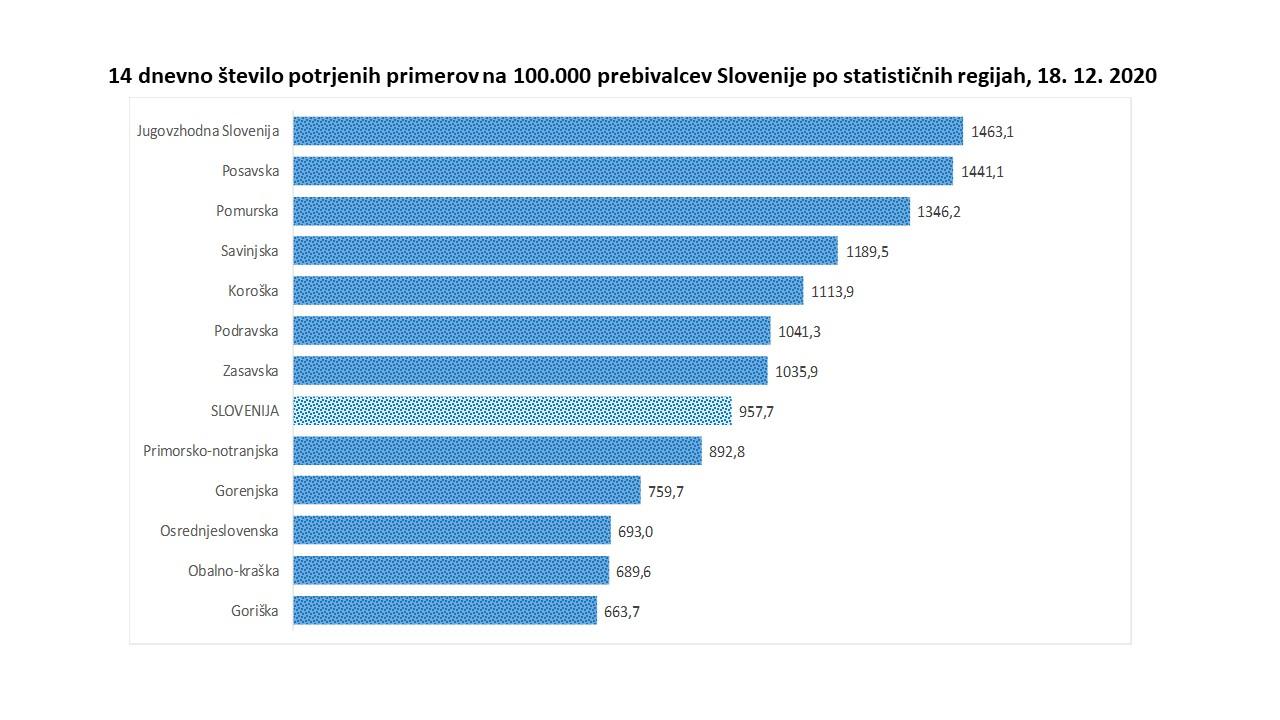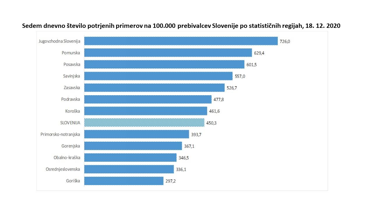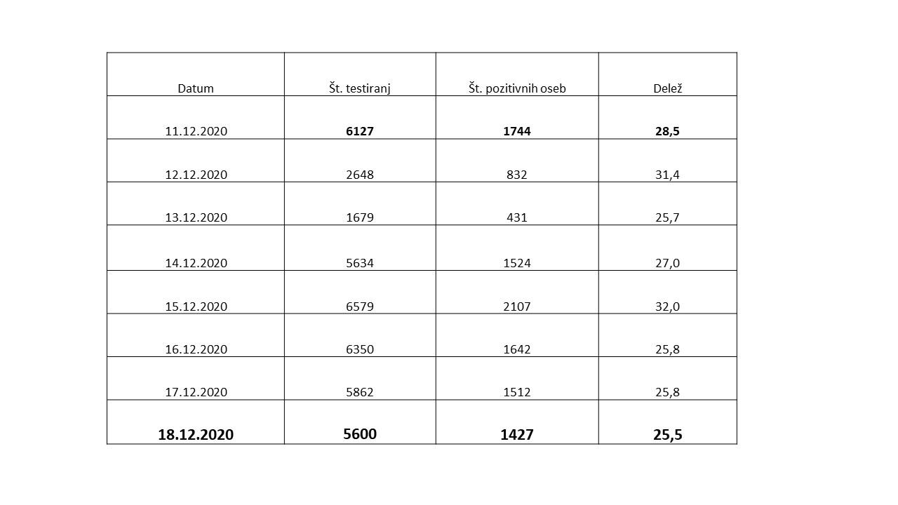 Včeraj je bilo opravljenih 5.600 testiranj. Potrjenih je bilo 1.427 novih okužb. Delež pozitivnih testov je znašal 25,48%. Število potrjenih primerov se, glede na prejšnji teden, znižuje že sedmi zaporedni dan. Včeraj je bilo novih okužb kar 317 manj kot v petek, 11. decembra.