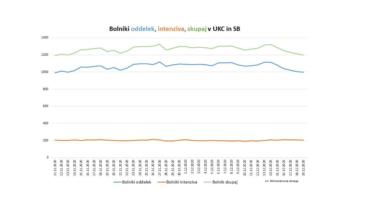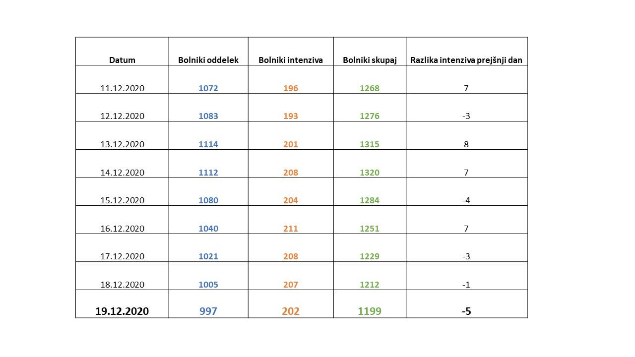 Včeraj je skupno število Covidnih pacientov prvič po več kot mesecu dni padlo pod 2000. Bolnišnično oskrbo je potrebovalo 1199 pacientov. 202 pacienta potrebovala intenzivno nego (5 manj). 104 sprejeti in 93 odpuščenih iz bolnišnic. Umrlo je 40 oseb.