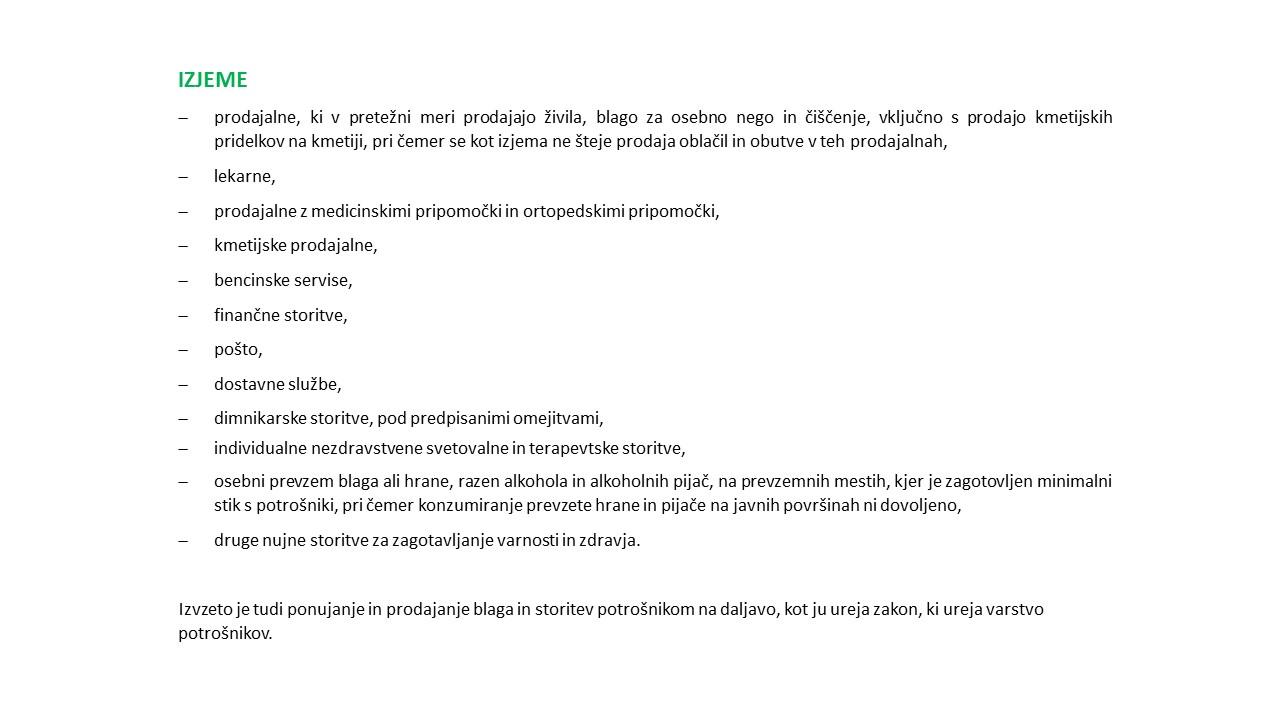 V tem času se znova zapirajo tudi trgovine z oblačili in obutvijo. Odprte pa ostajajo prodajalne z živili, izdelki za osebno nego in čiščenje, lekarne in trgovine z medicinskimi pripomočki, bencinski servisi, banke in pošte ter dimnikarske službe. Obratovale bodo dostavne službe, dovoljen bo prevzem blaga, razen alkohola.