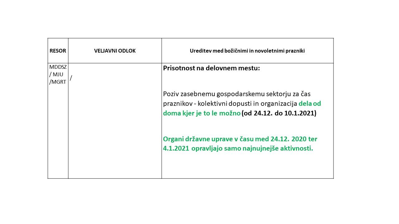 "Poziv zasebnemu gospodarskemu sektorju za čas praznikov - kolektivni dopusti in organizacija dela od doma kjer je to le možno (od 24. 12. do 10. 1.) Organi državne uprave v času med 24. 12. ter 4. 1. opravljajo samo najnujnejše aktivnosti," je poudaril Kacin.