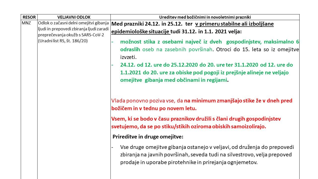 od 12. ure do 25. 12. do 20. ure ter 31. 12. od 12. ure do 1. 1. do 20. ure za obiske ne veljajo omejitve gibanja med občinami in regijami. Vlada ponovno poziva vse, da na zmanjšate stike že v dneh pred božičem in v tednu po novem letu.