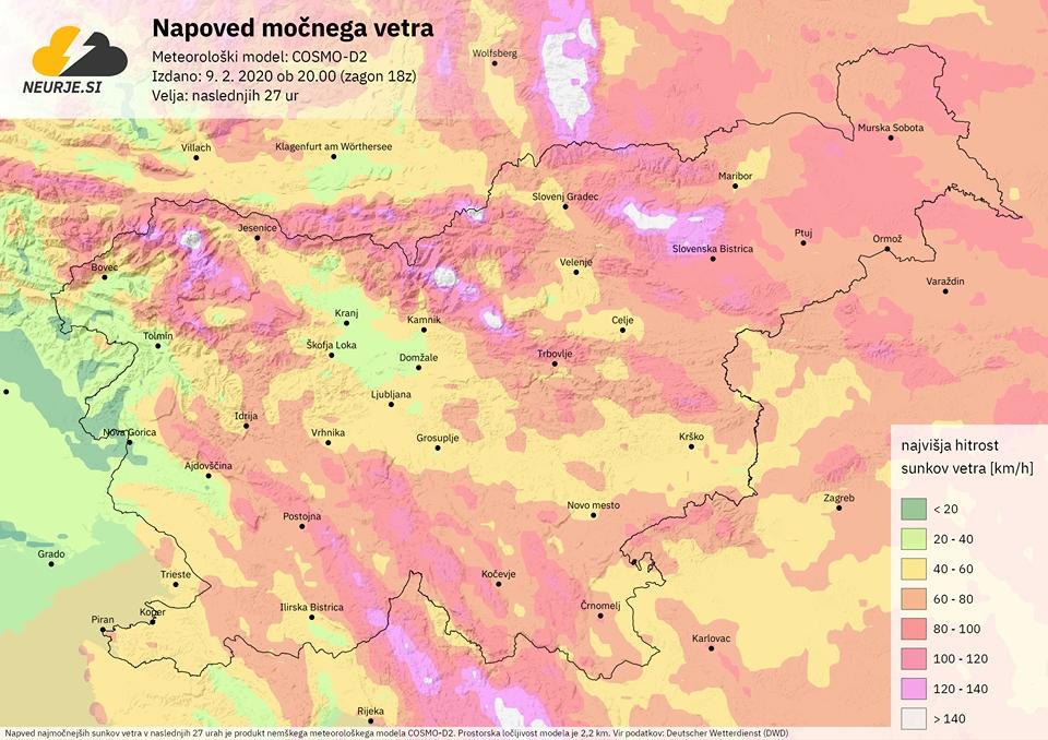 Ponoči se bo veter še naprej krepil. Vrhunec bo dosegel jutri dopoldne in čez dan, ko lahko po nižinah in gričih severovzhodne Slovenije (Podravje, Slovenske Gorice, Prekmurje, Haloze) sunki jugozahodnika, na izpostavljenih mestih, dosežejo hitrosti med 80 in 100 km/h, lokalno kje tudi preko 100 km/h.