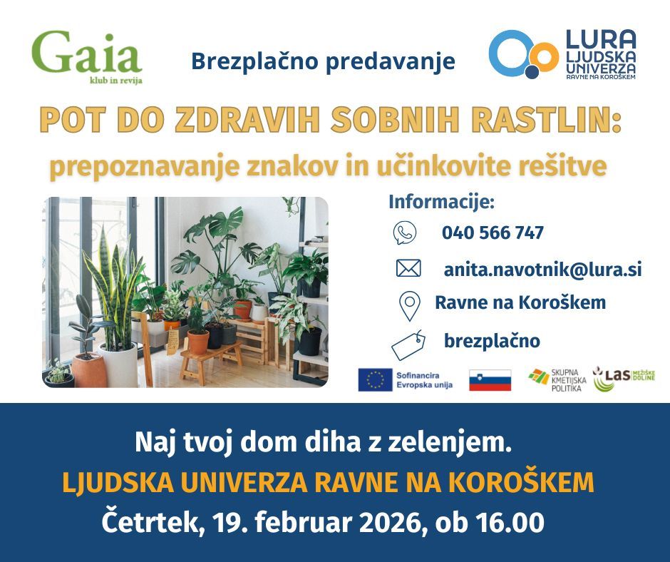 Brezplačno predavanje bo potekalo v četrtek, 19. februarja 2026, od 16. do predvidoma 17.30 ure, na Ravnah na Koroškem, točno lokacijo pa bodo na LURI sporočili naknadno. Predavala bo Nevenka Breznik Beton, univ.dipl.inž.agr., ki že več kot 20 let piše za revijo Gaia, predava in svetuje o uspešnem vrtnarjenju na zelenjavnem in okrasnem vrtu ter o načrtovanju vrtov in ureditvi trate. Njeno strokovno znanje zajema širok spekter tem – od izbire rastlin do optimizacije njihove rasti in zdravja. Posebej se posveča boleznim, škodljivcem in fiziološkim poškodbam ter ekološkemu vrtnarjenju ter naravi prijaznim metodam nege.