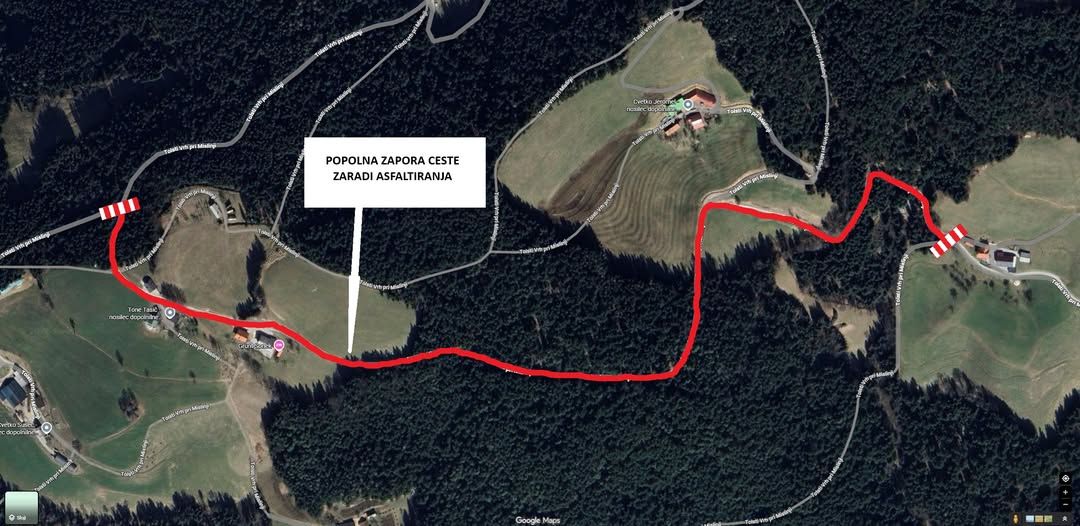 Občina Mislinja obvešča vse občanke in občane ter ostale udeležence v prometu, da bo od srede, 8. aprila 2026, do petka, 10. aprila 2026, do 17. ure popolna zapora na odseku LC Šentlenart–Zlodej–V. graben (od kmetije p. d. Timošek do kmetije p. d. Pačnik)