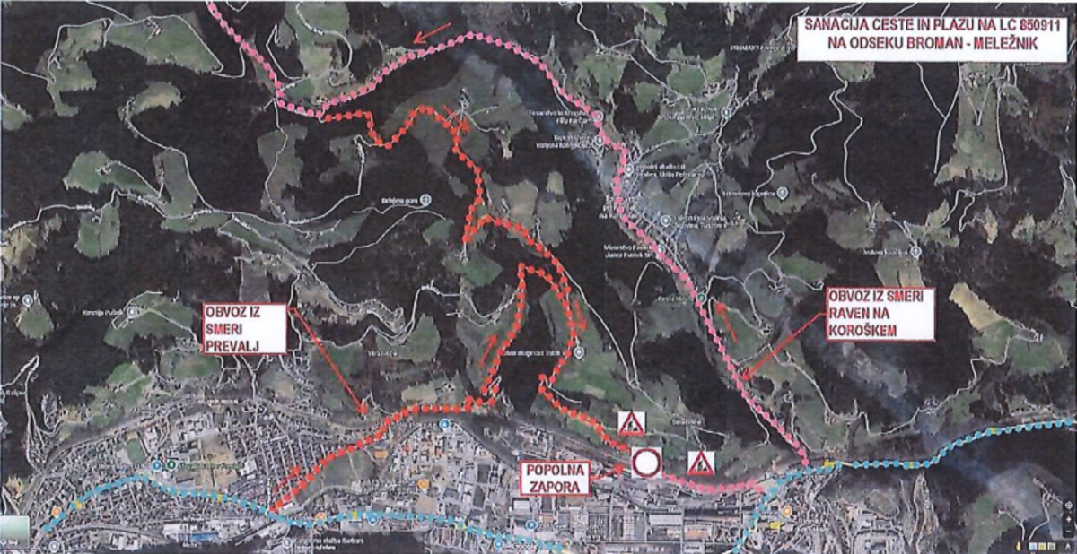 V času zapore bo urejen obvoz iz smeri Prevalj: (Pod gonjami - Rojak - Meležnik) in iz smeri Zelen Brega - mlekarna: (mlekarna - Bromanov mlin - Meležnik)