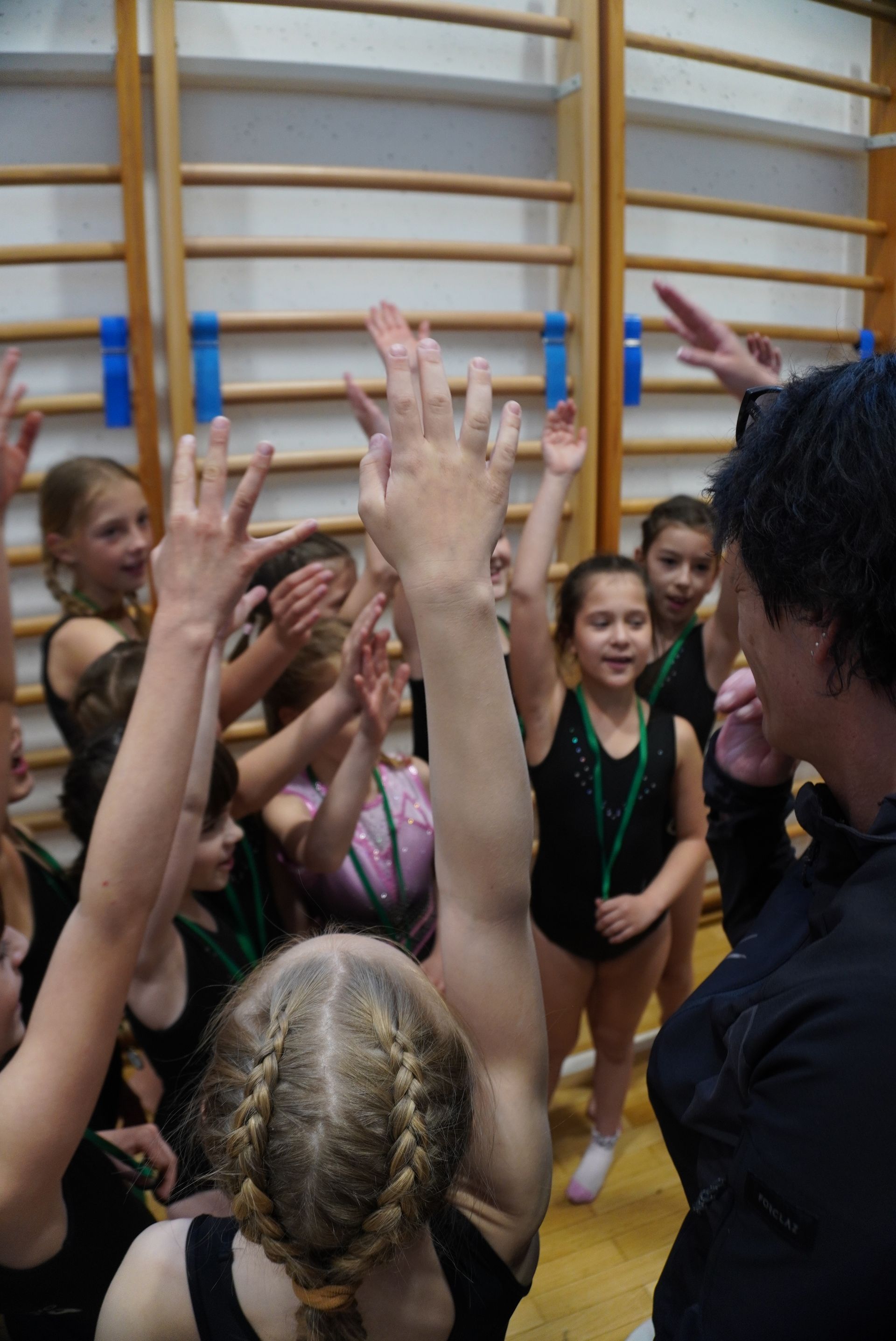 Po koncu nastopov so dekleta skupaj s trenerkami z značilnim pozdravom proslavila svoje dosežke.