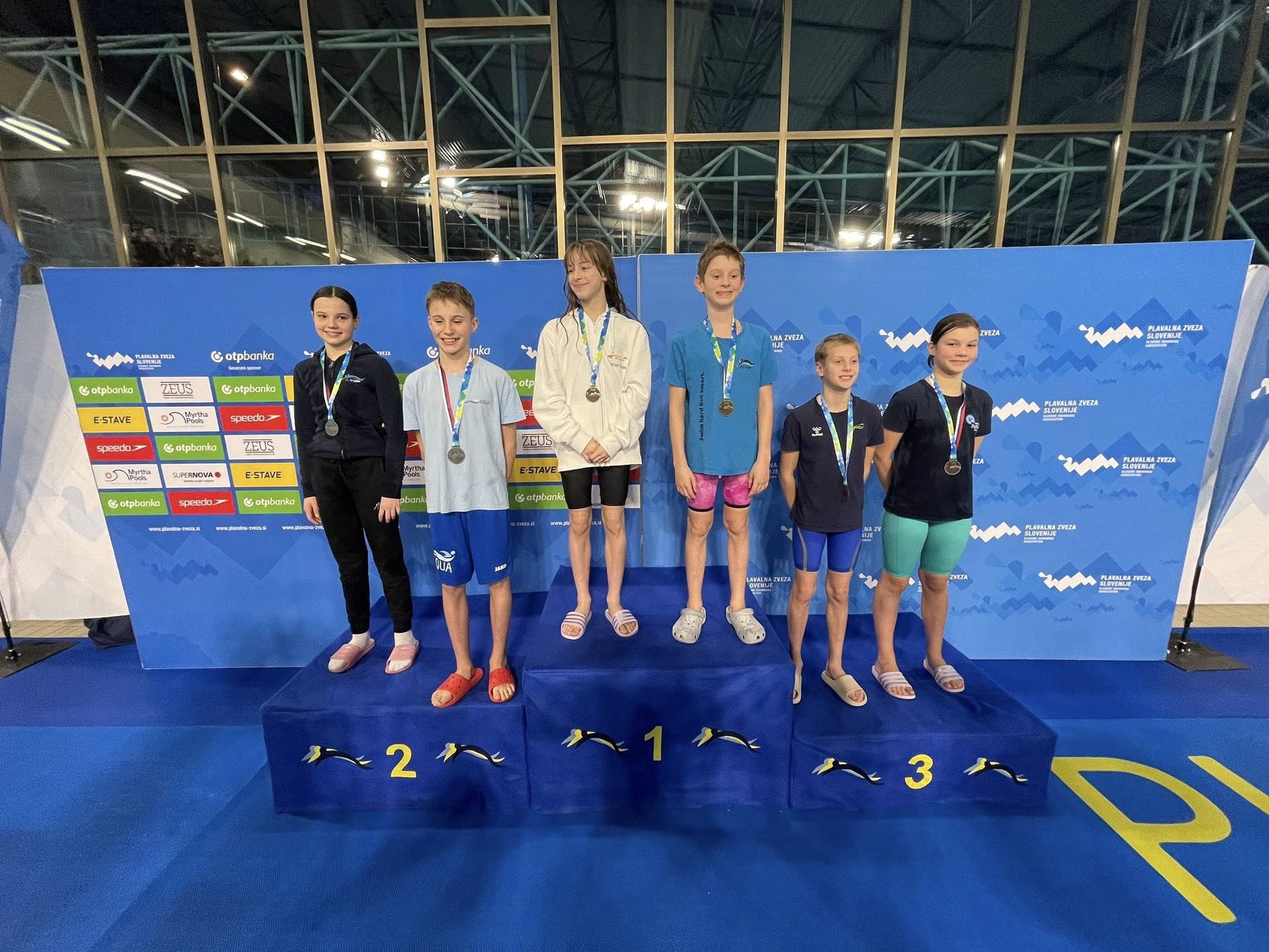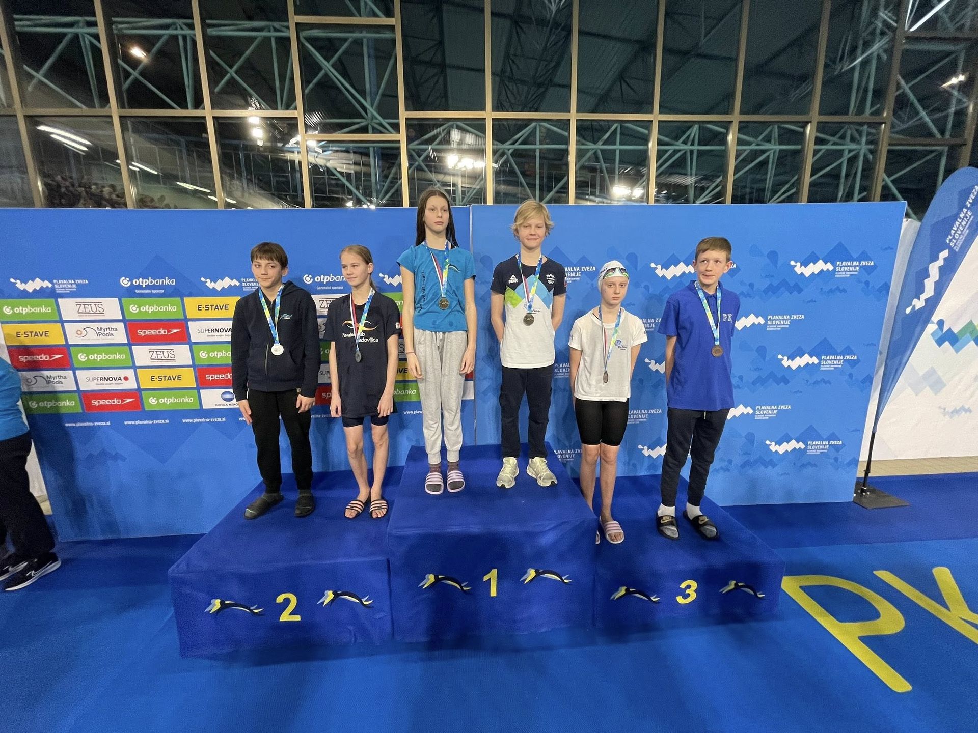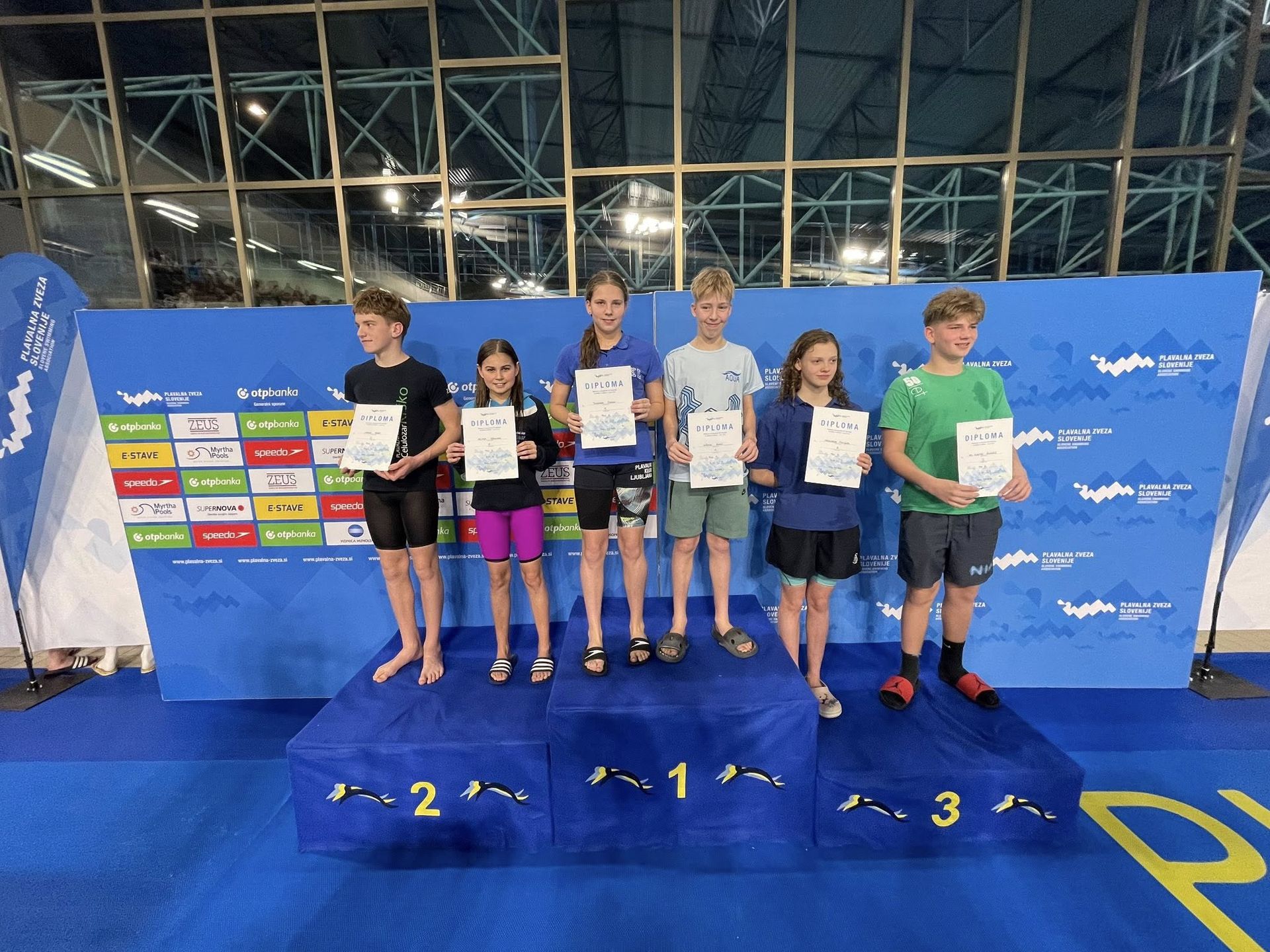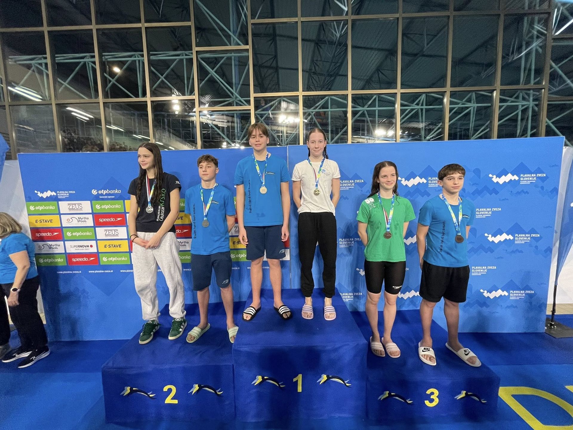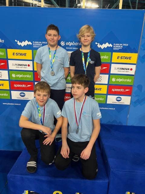 Uspešne so bile tudi štafete, štafete mlajših dečkov v postavi Anže Kos, Luka Plesec, Aljaž Meško in Ažbe Kolar je bila srebrna na 4x200 prosto, na 4x100 prosto pa bronasta, prav tako je bila bronasta štafeta mlajših deklic 4x100 prosto v postavi Glorija Gnamuš Šlebnik, Zala Gorenšek, Zala Simonič.