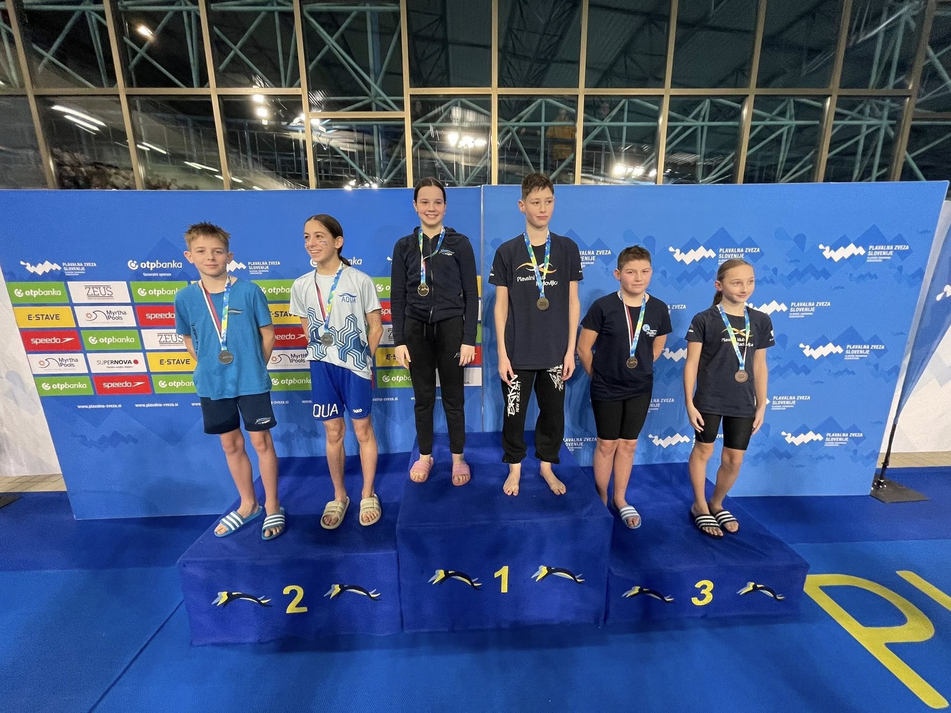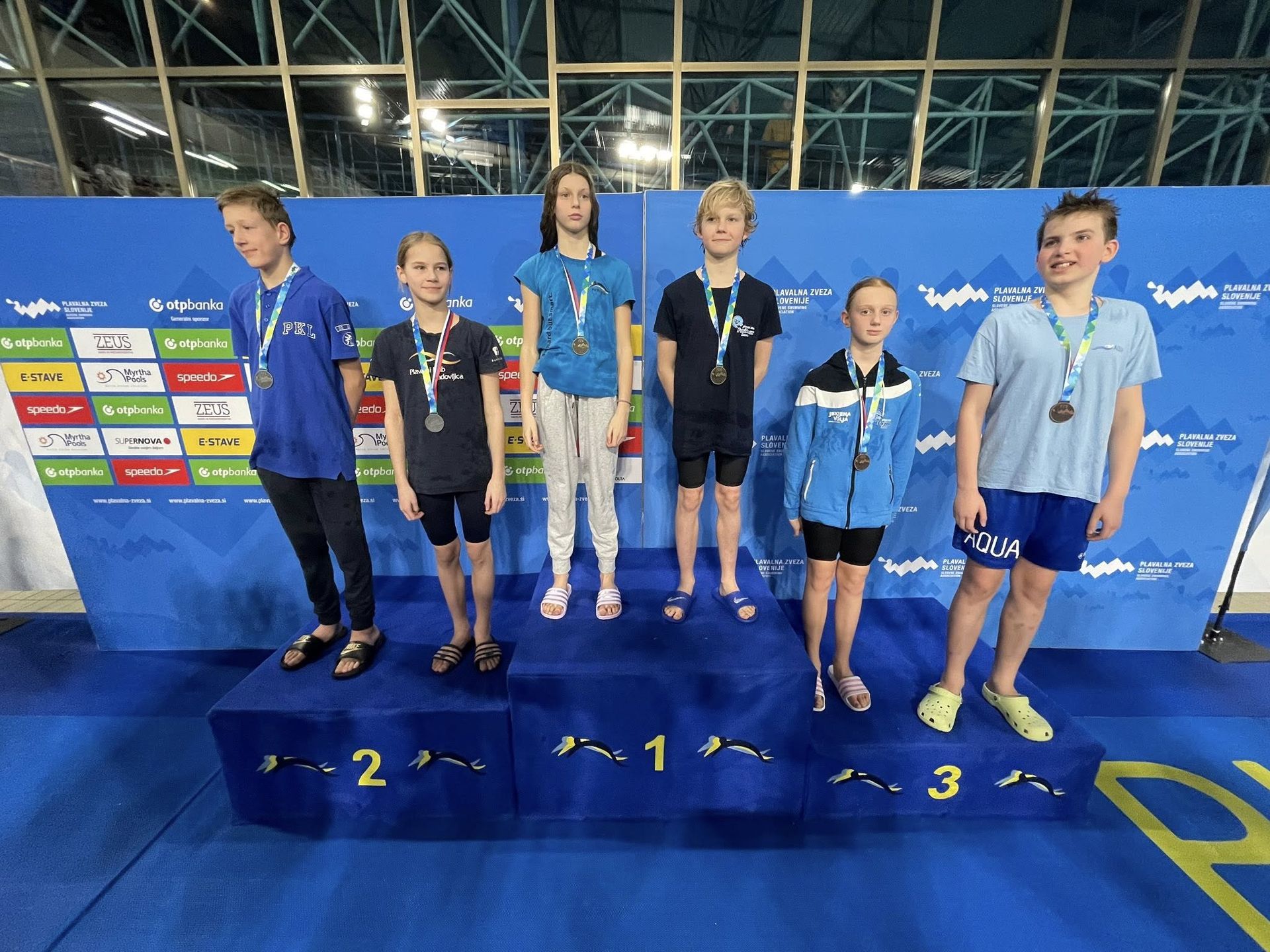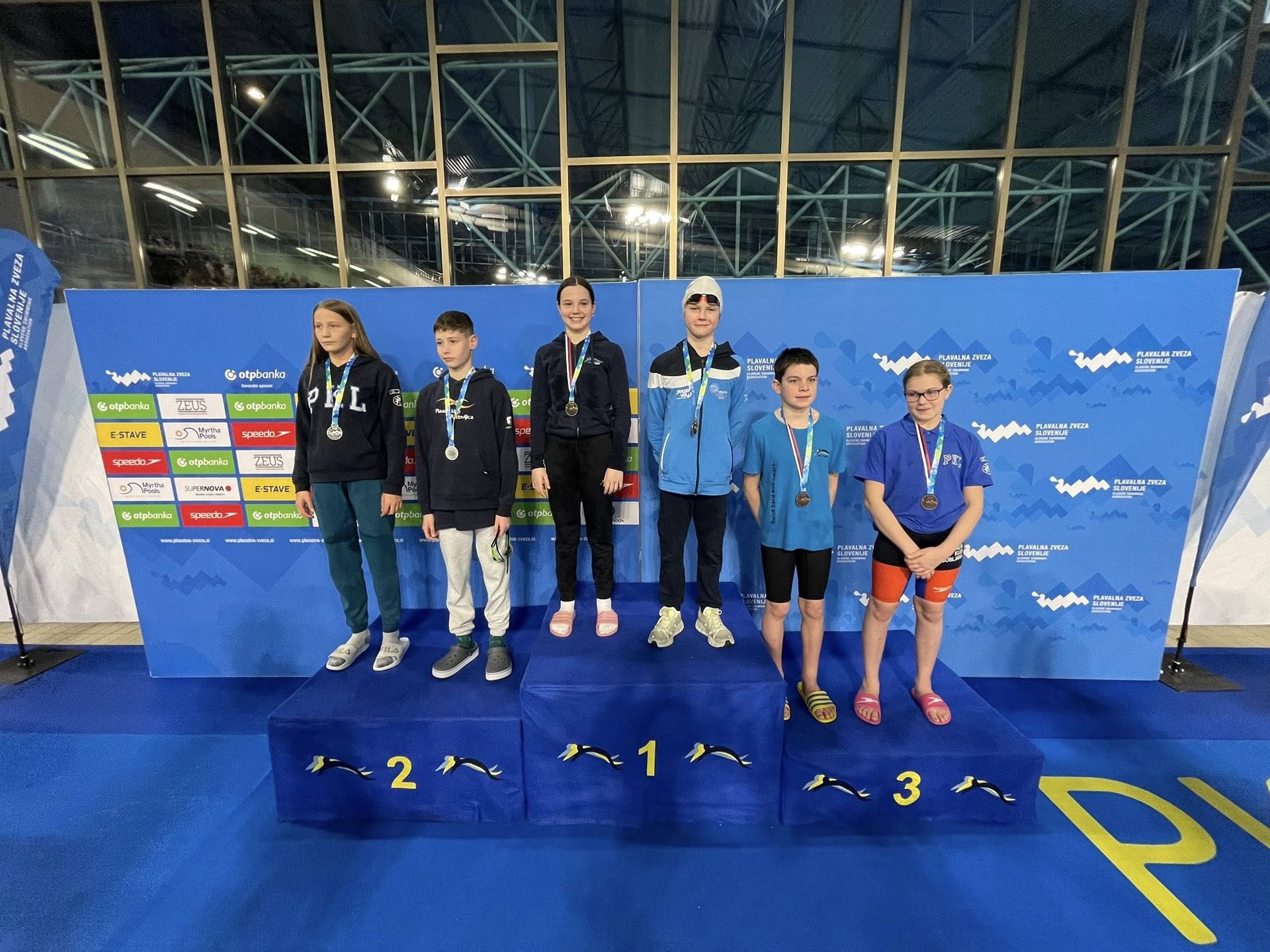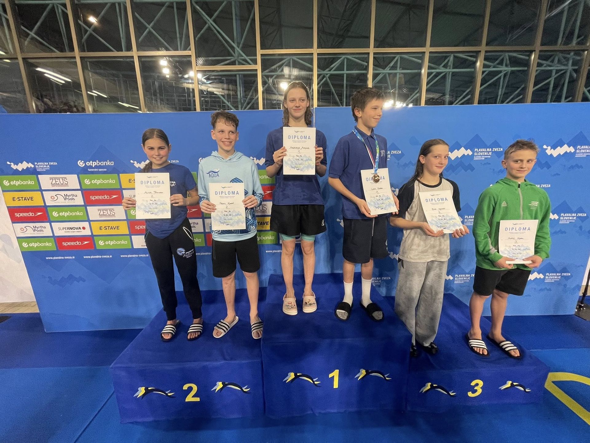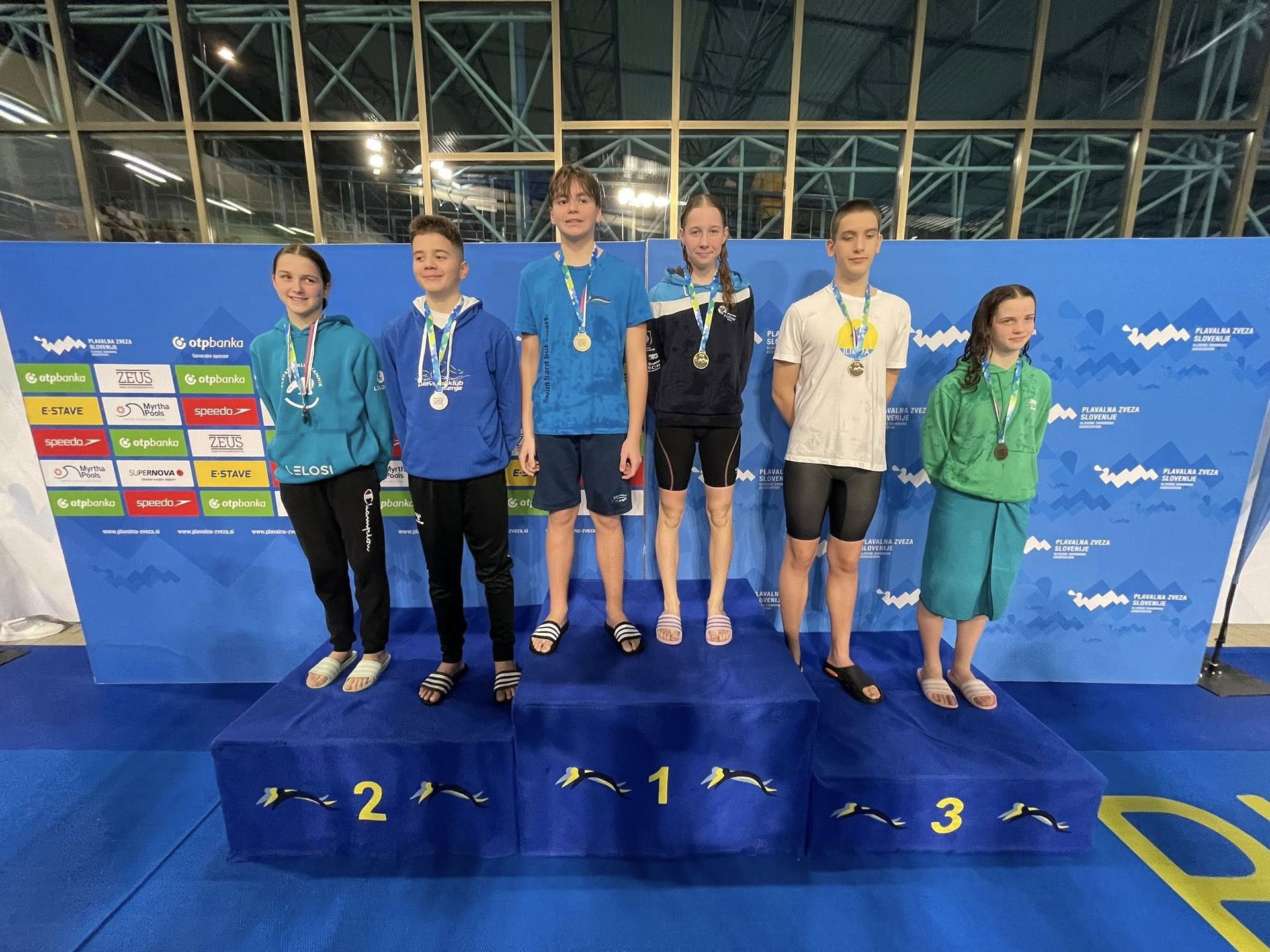 Uspešne so bile tudi štafete, štafete mlajših dečkov v postavi Anže Kos, Luka Plesec, Aljaž Meško in Ažbe Kolar je bila srebrna na 4x200 prosto, na 4x100 prosto pa bronasta, prav tako je bila bronasta štafeta mlajših deklic 4x100 prosto v postavi Glorija Gnamuš Šlebnik, Zala Gorenšek, Zala Simonič.