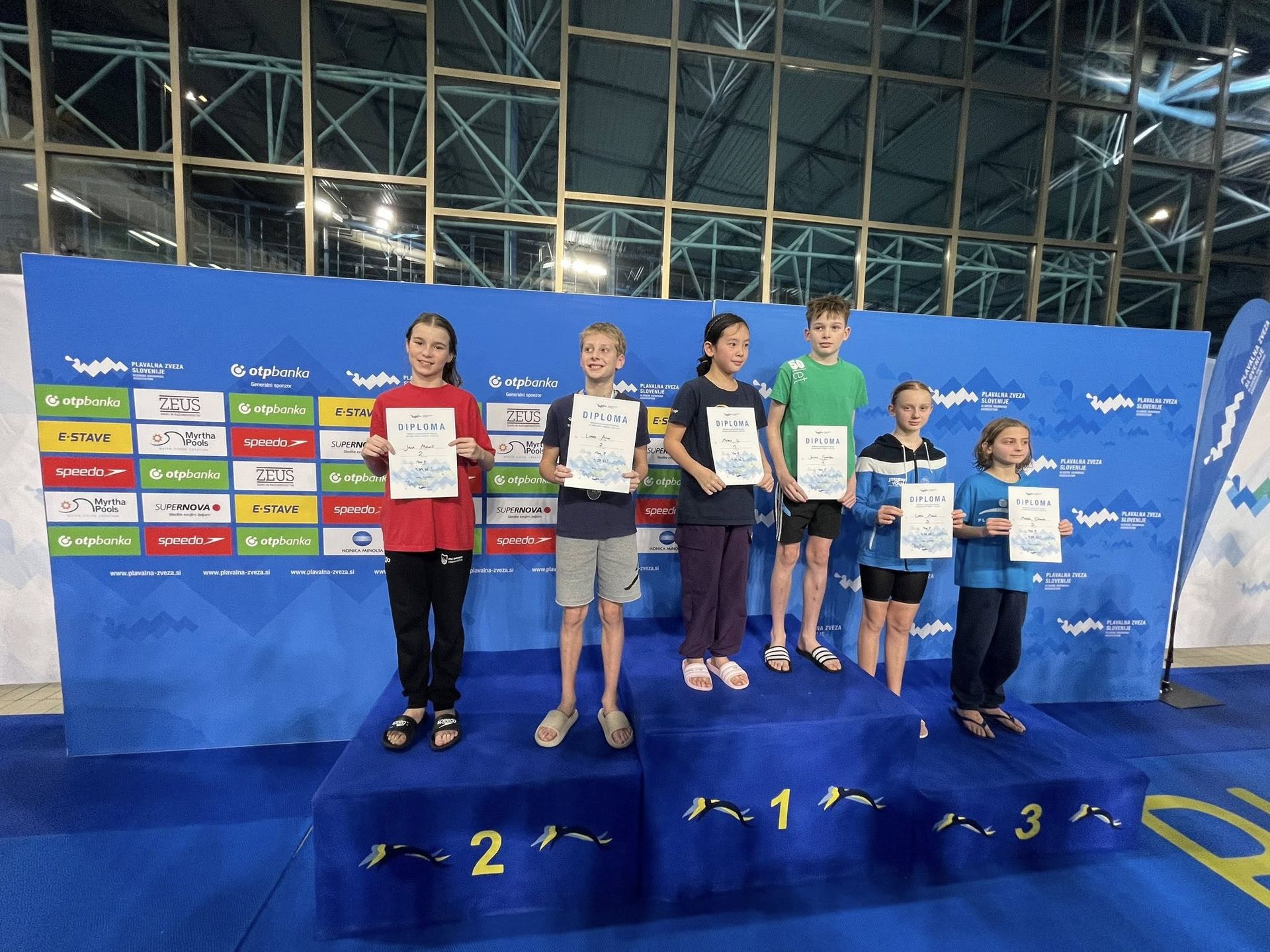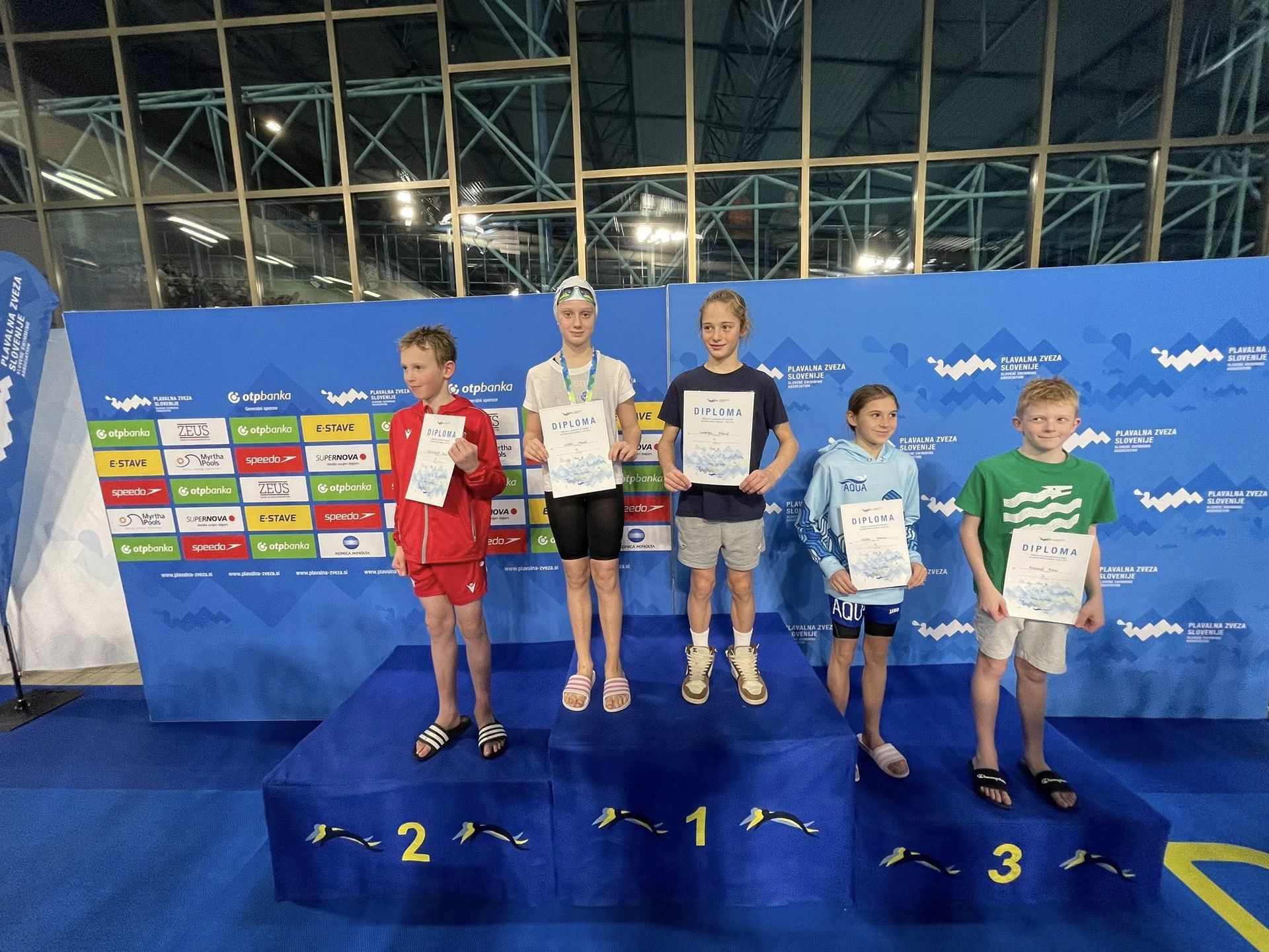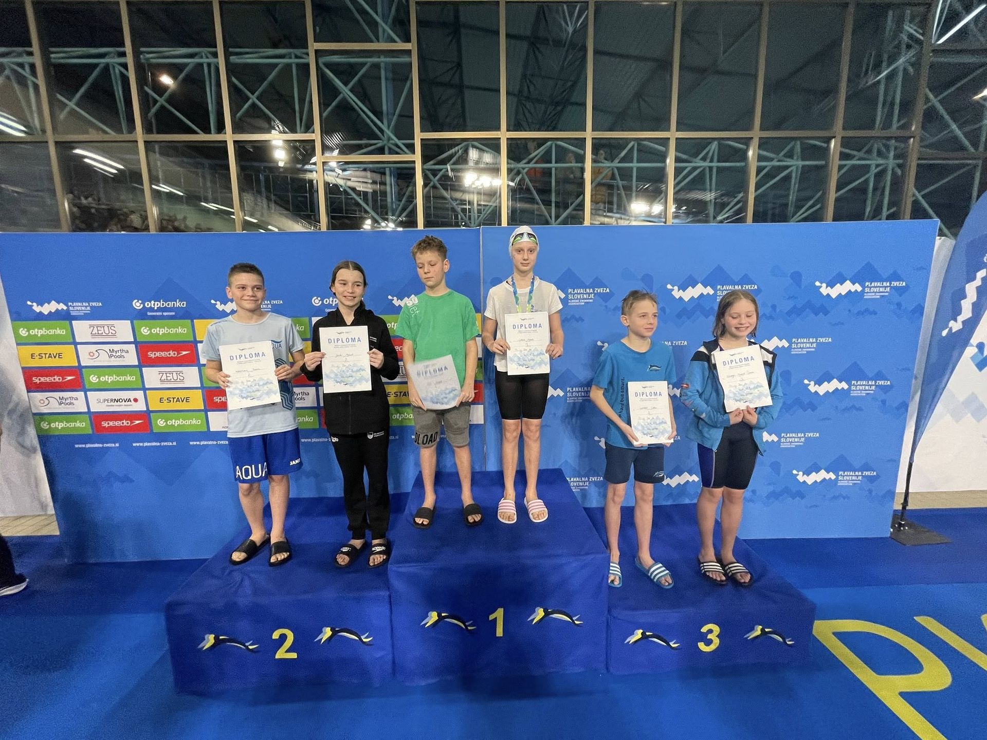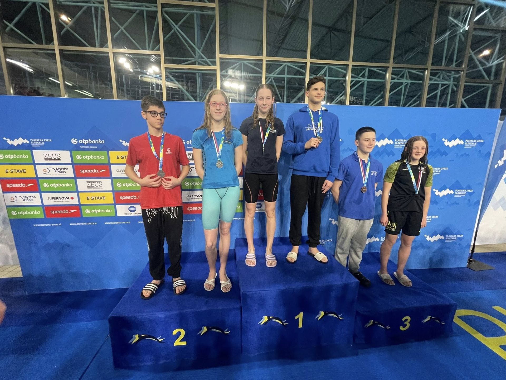 Uspešne so bile tudi štafete, štafete mlajših dečkov v postavi Anže Kos, Luka Plesec, Aljaž Meško in Ažbe Kolar je bila srebrna na 4x200 prosto, na 4x100 prosto pa bronasta, prav tako je bila bronasta štafeta mlajših deklic 4x100 prosto v postavi Glorija Gnamuš Šlebnik, Zala Gorenšek, Zala Simonič.