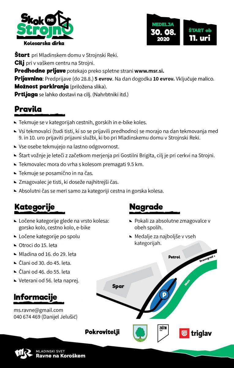 V nedeljo, 30. avgusta, bo potekal drugi kolesarski »Skok na Strojno«. Gre za kolesarsko preizkušnjo, rekreativne narave, v katero se lahko vključijo kolesarji vseh starostnih kategorij in zvrsti koles (cestno, gorsko in e-bike). Start bo ob 11h pri Mladinskem domu v Strojnski reki. Cilj dirke je v vaškem centru na Strojni, ki je od izhodišča oddaljen 9,5 km. Do 28. avgusta potekajo predprijave preko spletne strani www.msr.si. Tam so na voljo tudi vse informacije o dirki. Prijave bodo možne tudi na dan dogodka.